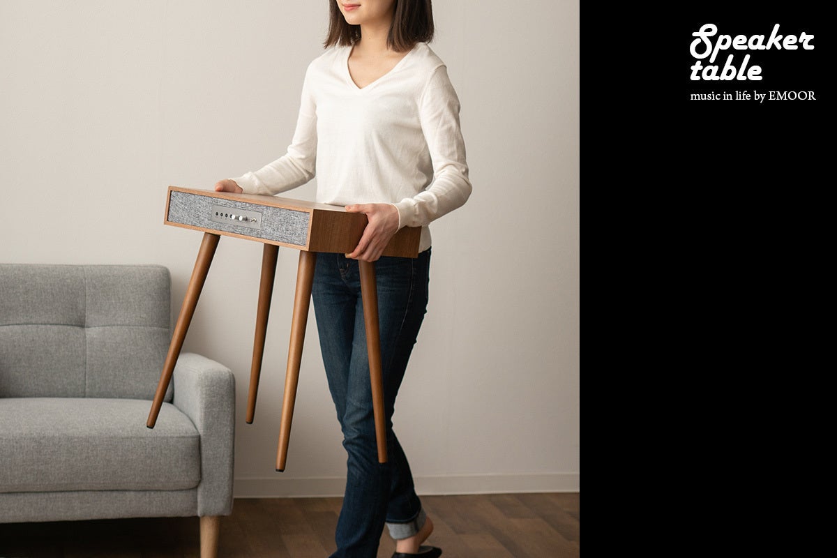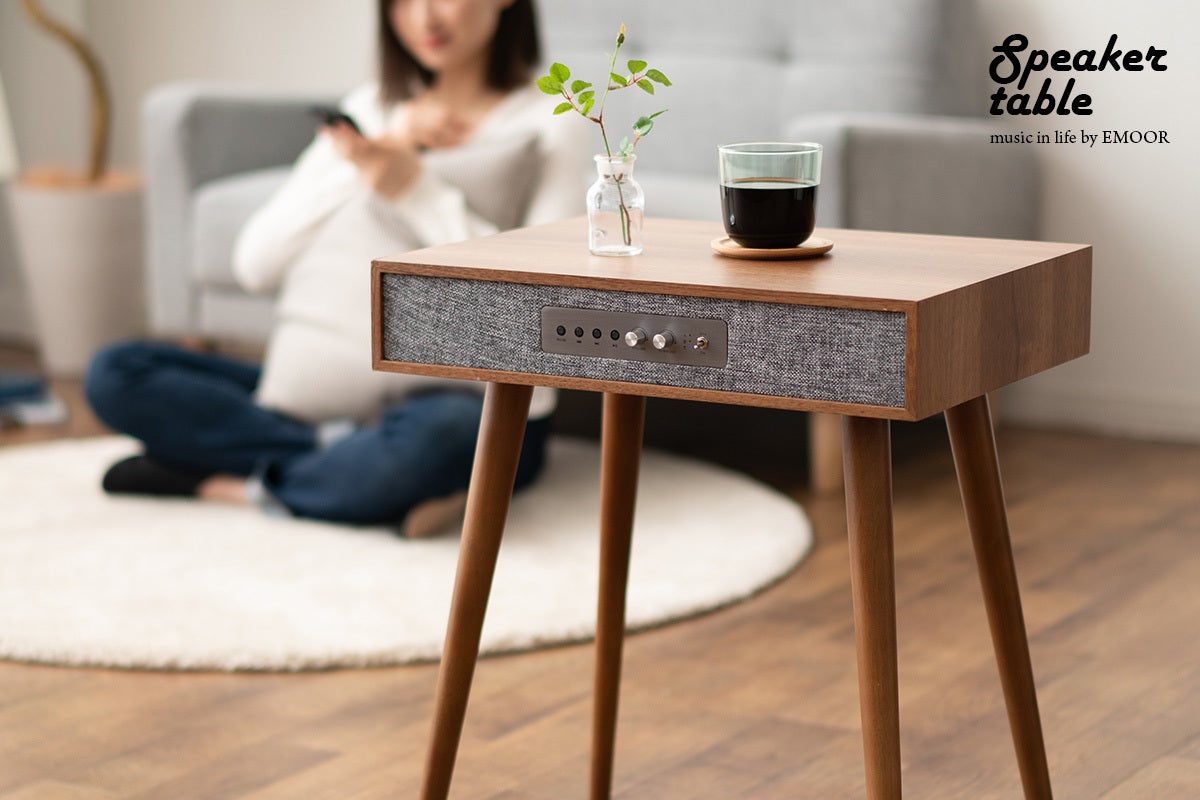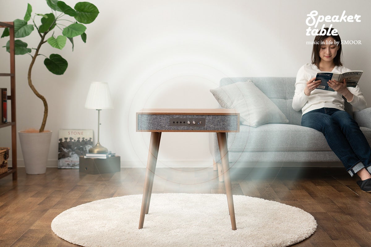 ナチュラルな木のテーブルと正面のアクセントとなっているファブリックとが相まって、スタイリッシュな印象を与えます。置く場所を選ばないニュートラルデザインは、さりげなく音楽を奏でるSPEAKER TABLEのコンセプトを体現しています。