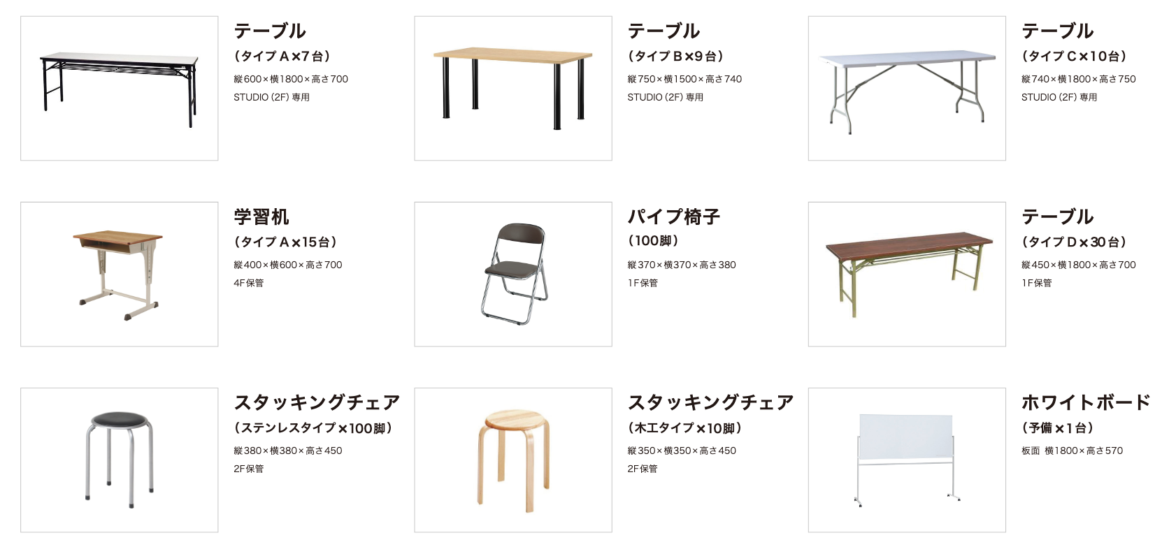 ◎マルシェ会場は1FIID ギャラリー予定。使用テーブルは1F保管のDタイプ。(縦450×横1800×高さ70)スタッキングチェアなど軽いものは2Fから運んで、ご使用可能。