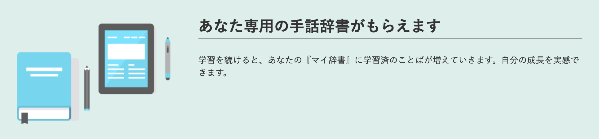 サインアイオーがあれば、自分の好きな場所、好きな時に、自分のペースでゆっくりと、手話を体系的に学ぶことができます。また、単語やフレーズもゲーム感覚でしっかり覚えることができます。