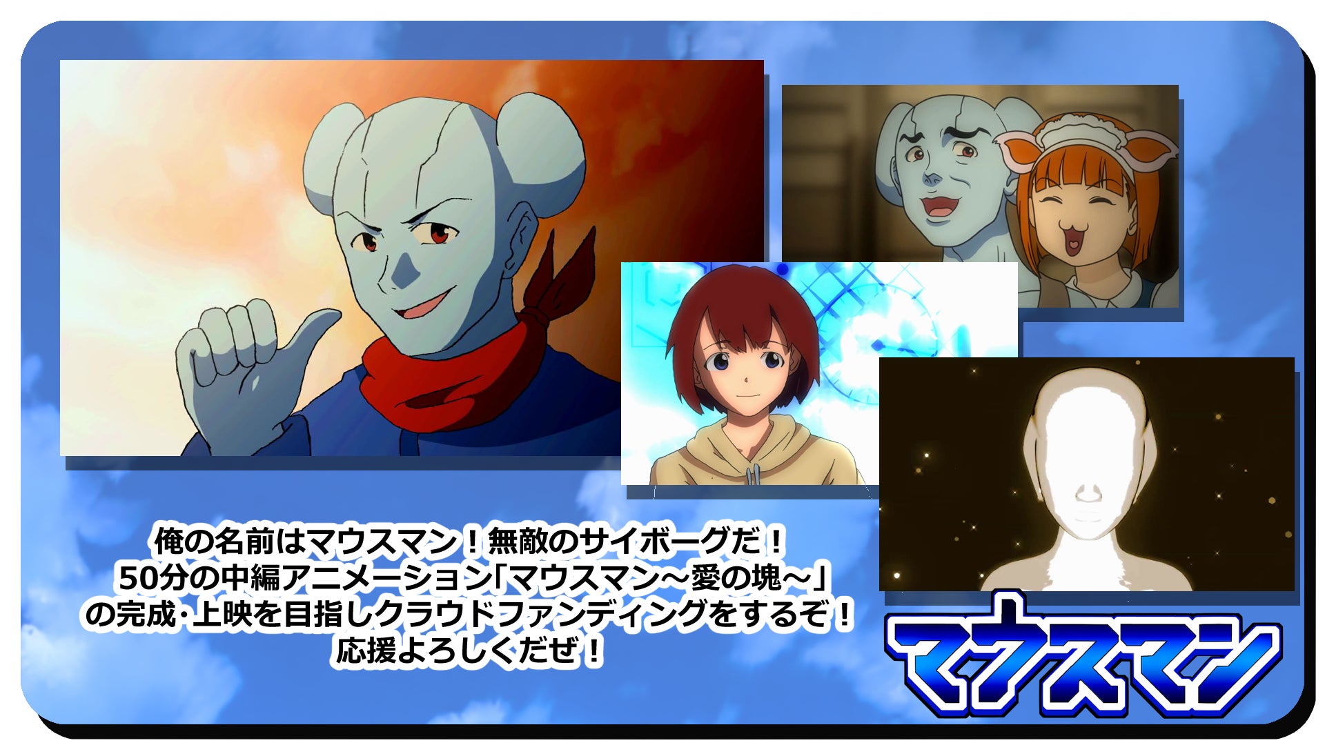 今回は俺っちが改造されて悪と戦っていく姿を映画にした自主制作アニメ映画「マウスマン~愛の塊~」の劇場公開を目指すクラウドファンディングだぜ!