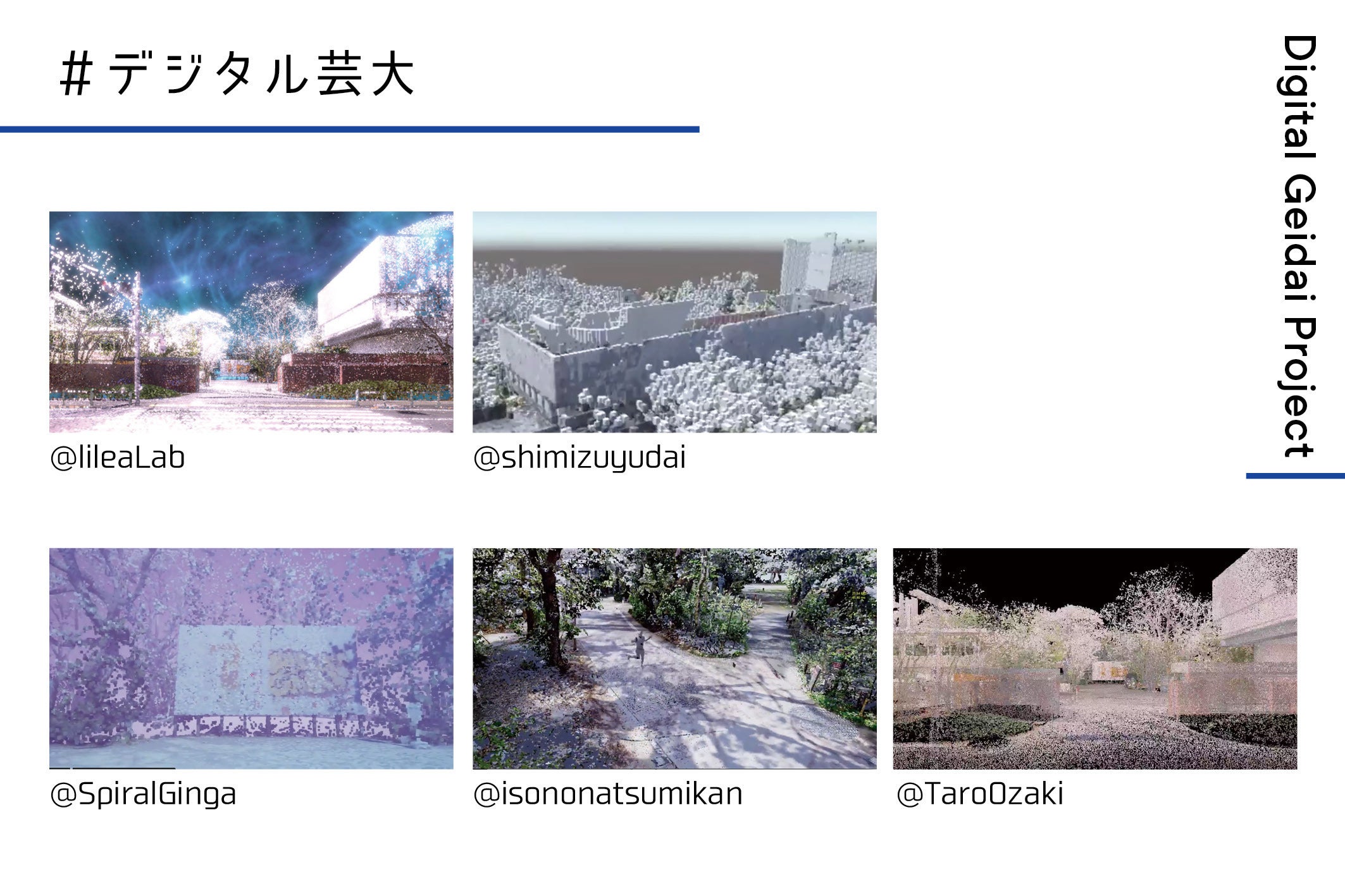 点群として取得したデータは学生やクリエイターの方々へ公開。3 次元データを活用した創作活動や自発的な研究が進んでいます。これまでに、技術と創意に満ちた自由な発想によって、点描やポリゴンなどを用いた加工表現や、影によって昼から夜へ時間の変化を表現したり、VR内でアバターがキャンパスを散策できるなど、デジタルのキャンパス内で多種多様な表現や楽しみ方が生まれました。