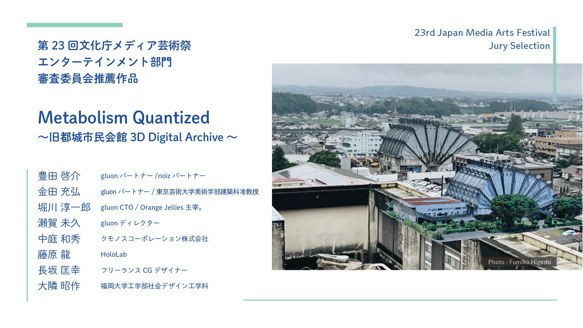 2020/03/06 13:00旧都城市民会館の3Dデジタルアーカイブプロジェクトが、第23回文化庁メディア芸術祭のエンターテインメント部門において、審査委員会推薦作品に選ばれました。文化庁メディア芸術祭は、アート、エンターテインメント、アニメーション、マンガの4部門において優れた作品を顕彰するとともに、受賞作品の鑑賞機会を提供するメディア芸術の総合フェスティバルです。第23回は、世界107の国と地域から3,566作品の応募があり、厳正なる審査の結果、受賞作品と審査委員会推薦作品が選出されました。活動を応援いただいた皆様に心より御礼申し上げます。■概要『Metabolism Quantized ~旧都城市民会館3D Digital Archive~』老朽化により維持が困難となった建築物を、複数の計測技術を組み合わせて精緻な3Dデータで保存。アーカイブとして建物の姿を後世に継承するだけでなく、ARやVR、ゲーム空間への転用など活用機会が拡張されることで、場所やスケールも自在に、物質性を超えた存在として建築を新陳代謝させた。■プロジェクトメンバー豊田 啓介 (gluonパートナー/noizパートナー)金田 充弘 (gluonパートナー/東京芸術大学美術学部建築科准教授)堀川 淳一郎(gluon CTO / Orange Jellies主宰)瀬賀 未久 (gluonディレクター)中庭 和秀 (クモノスコーポレーション株式会社 代表取締役社長)藤原 龍 (HoloLab)長坂 匡幸 (フリーランスCGデザイナー)大隣 昭作 (福岡大学工学部社会デザイン工学科)■協力都城市、クラウドファンディングにご支援いただいた皆様、xRArchi もっと見る