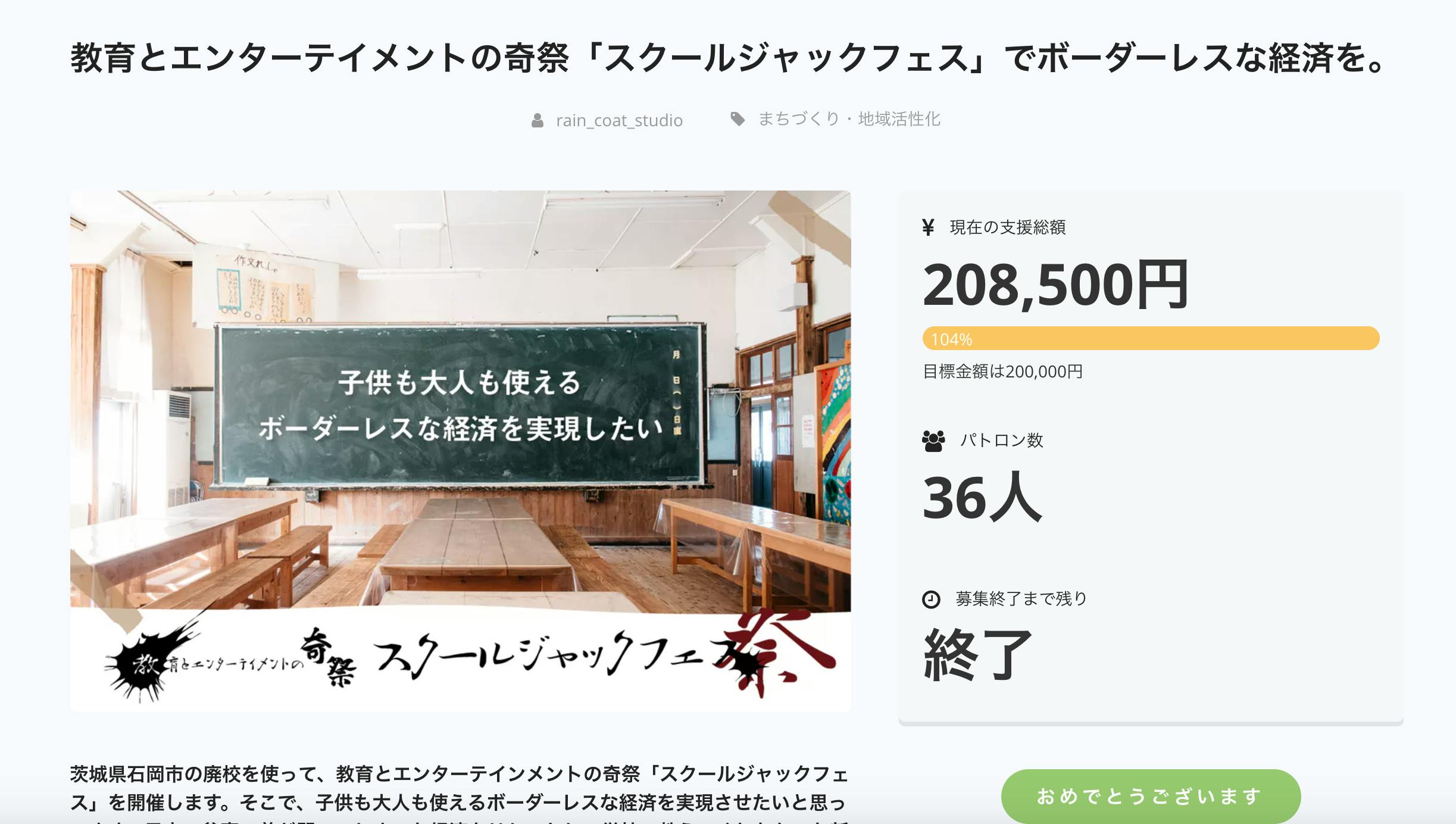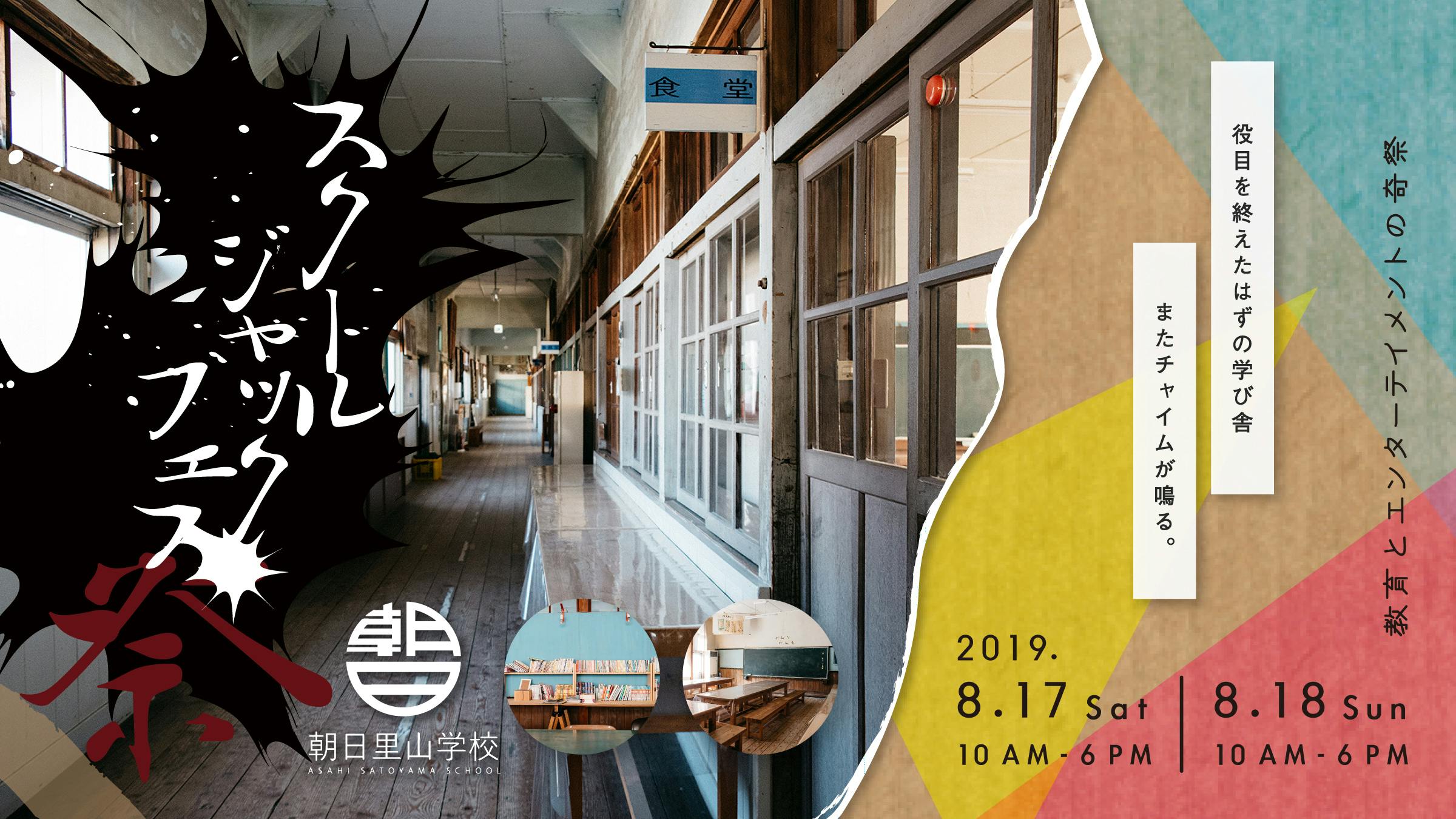 2019/08/07 09:57改めまして、クラウドファンディングにご支援・ご声援をいただきまして誠にありがとうございます><さて当プロジェクトの開催日程と当日の全貌が解禁となりました!開催日時は8月17日(土)〜18日(日)となります。場所は当初の予定通り朝日里山学校(茨城県石岡市柴内630)です★公開されているプロジェクトページにも記載されてますがイベントの主な特徴は、主に3つあります。❶ 【 EDUCATION × MONEY 】:子供も大人も使える"おすそわけの経済システム" 今回のプロジェクトでいただいた支援は、小学生以上の参加者・来場者全員に分配します!スタッフも大人も子供も全員平等に渡されます。そして、資金の一部は国外の栄養失調の子供達に送る食料にも充てさせていただきます。つまり、みなさまの資金を世界中の誰かの元に"おすそわけ"をし、その"おすそわけ"は、会場でまた誰かの元に"おすそわけ"されていきます。時代や文明、技術の進化が目まぐるしく加速する中、あえて私たちは、目に見え、手に取ることができる"イベント通貨"を用意したいと思ってます。 自分に使っても良いし、お隣にいる人に使っても構いません。自分にとって有益になると思うものに対して、自由にお使いいただけます。そんな優しさが循環するプロジェクトとなってます。 ❷ 【 EDUCATION × WORK SHOP 】:義務教育では教わらない農業体験やワークショップ 学校では教わらなかった特別授業やヨガ教室などをはじめ、蕎麦打ち教室、長廊下雑巾掛けなども?!地元の講師から課外授業を体験できます。また、ハンドメイド作家によるクラフトマーケットやイベントでしか食べられないフード、さらに各市町村を超え、市議会議員によるセッションなどボーダーレスな要素が盛り沢山です!「つくる × つかう × 体験」から多くのことを学べます。 ❸ 【 EDUCATION × MIND 】:世代を越え、時代を越え、心で繋がるプロジェクト 懐かしの給食の時間やラジオ体操の時間、そして1日目のイベント終了後は、焚き火を囲んでキャンプをし、談笑します。星空を眺めてもいいし、夕食をみんなで作って食べても良いし、普段話せなかった人たちとの貴重な時間を過ごしましょう。また、学生時代の写真を参加者同士で持ち寄り、教室の黒板に貼り付け、“あの頃”を参加者全員で共有する「Re:チャイムプロジェクト」も実施。集めた写真を2日間で次々貼っていき、1つの作品を作り上げていきます。 世代や時代を越えた、そんな心温まる時間を過ごします。当日何が起こるかわからない。世界規模でみたら小さな革命かもしれませんが、きっとこのイベントで、義務教育では教わらなかった考え方や優しさを体験できるそんな2日間となることでしょう☆是非、8月17日〜18日かその小さな革命を見にいらしてください♫ もっと見る