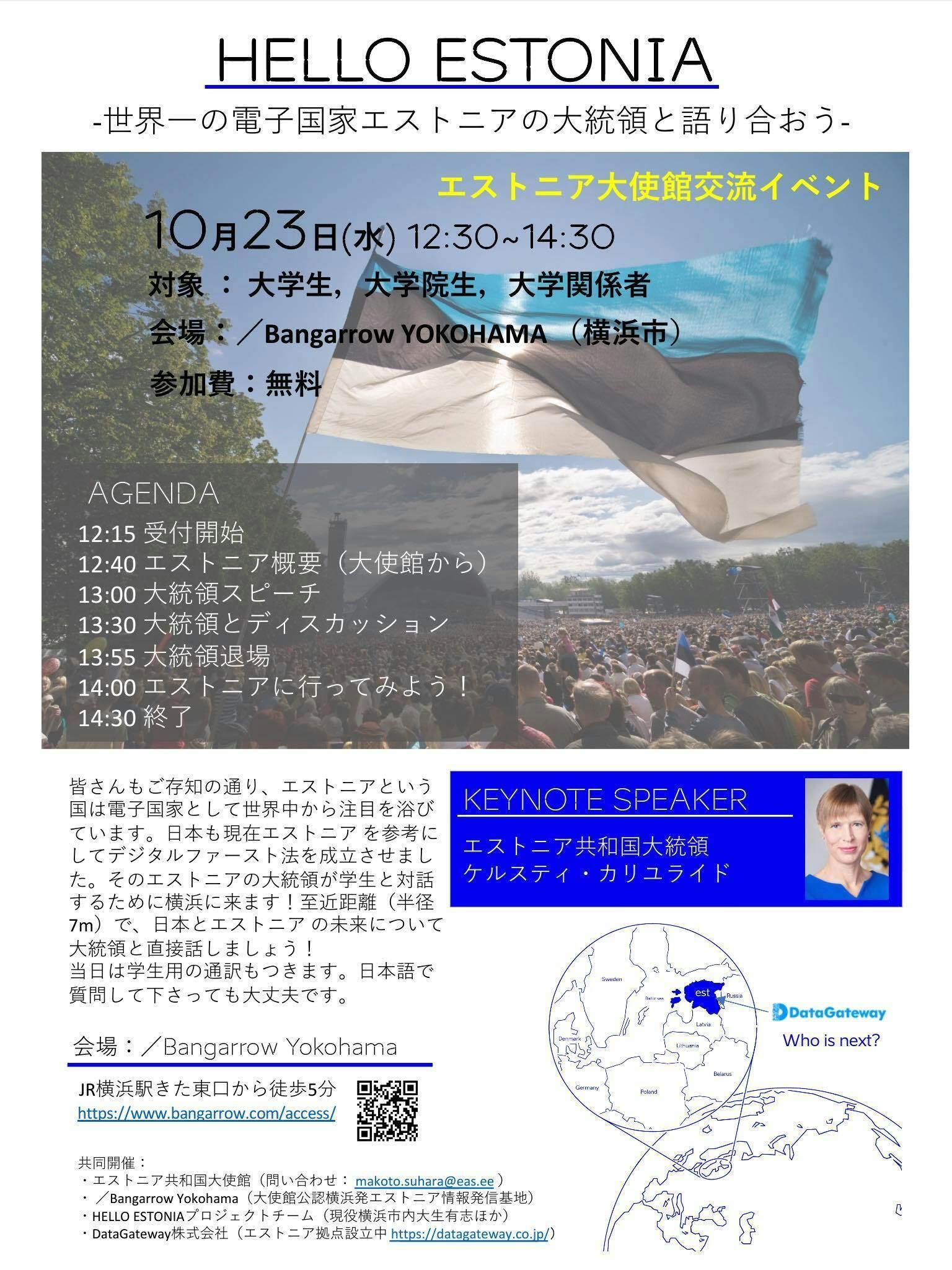 2019/10/16 21:17皆様、お久しぶりです。今回、横浜にてエストニア共和国大使館、/Bangarrow Yokohama様、DataGateway株式会社様、そして私達での共催のもと、エストニア共和国の大統領とのトークイベントを開催することになりました!電子国家として注目を集めているエストニアの大統領と直接、間近で話すことができます!今回は大学生、大学院生および大学関係者が対象となります。英語が話せなくても、通訳がついているのでご安心ください。私たちも前座として少し喋らせていただきます。日時:2019年10月23日 12:15受付開始会場:/Bangarrow Yokohama(会場までのアクセスはこちら)参加費:無料参加希望の方、以下のURLから申し込みお願いします↓https://hello-estonia.peatix.com/(当日、直接会場にお越し頂いても構いません。ですが、その場合会場の大きさの関係で入場できない可能性がございます。)皆様のご参加、心よりお待ちしております! もっと見る