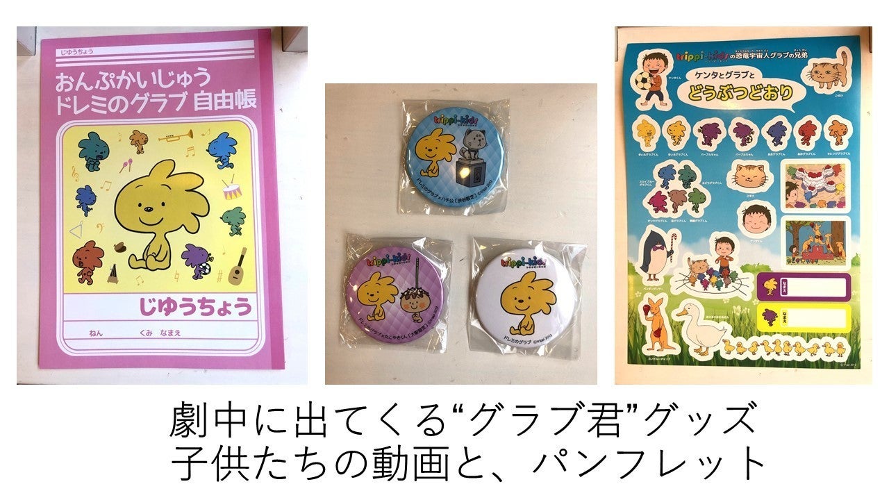 この"グラブ君”は、”恐竜宇宙人グラブ君”と言いまして、もともと、トリッピー表現力教室のオリジナルキャラクターです。それを、子供たちがお芝居に入れたい!と言い始め、最終的には、主人公のお父さんの商売が、このキャラクターのグッズ屋という設定になりました。実際に、舞台セットやセリフにも登場します。