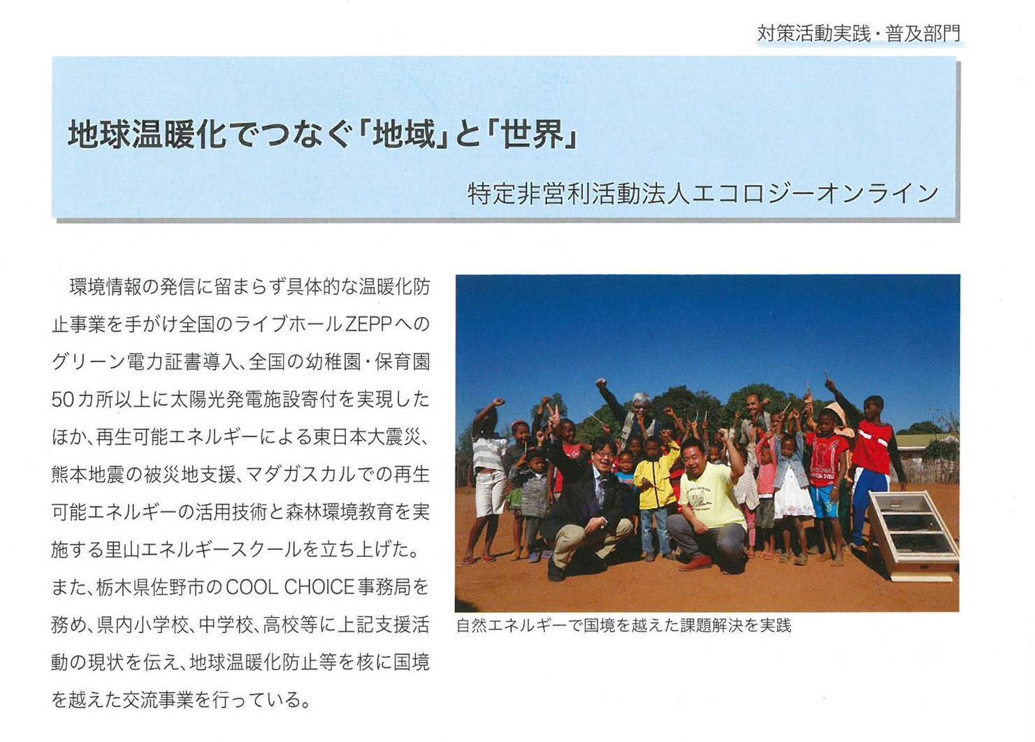 国境を越えた地球温暖化防止活動が「環境大臣表彰」を受賞