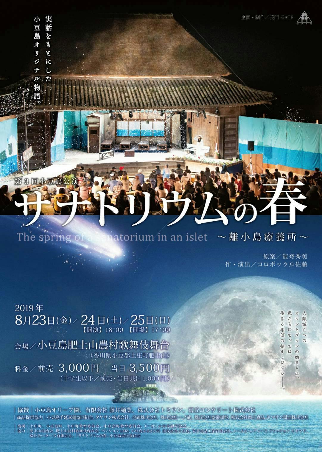 2019/07/22 16:28芸門-GATE- 第3回小豆島公演【作・演出】コロポックル佐藤【タイトル】サナトリウムの春 ~離小島療養所~【あらすじ】人類滅亡へのカウントダウンの始まりは、私たちにとっては、生きる希望の始まりだった――。1911年、日本で初めてオリーブの栽培に成功したのは瀬戸内海にあるひとつの島だった。この話は小豆島にオリーブの花が咲く前の年の話である。1910年ハレー彗星が地球に近づき、地球上の空気が5分間ほど無くなる。日本でもパニックとなり自殺する者もでた。その島に不治の病の結核患者が入る療養所(サナトリウム)があった。そこに住む希望をなくした人達に待っていたものとは・・・実話をもとにした、小豆島オリジナル物語――。■期間2019年 8月23日(金)/24日(土)/25日(日)開演/18:00 開場/17:00■会場小豆島肥土山農村歌舞伎舞台(香川県小豆郡土庄町肥土山)■チケット前売 /3,000円 当日/3,500円 中学生以下/前売・当日共に1,000円【チケットネットご予約】●こりっち https://stage.corich.jp/stage_main/82971■送迎バスのご案内※舞台ご観劇の方専用の土庄港~会場間の無料送迎バス【行き】出発地/土庄港観光センター発車時刻/17時15分 ※満席になり次第出発【帰り】出発地/肥土山農村歌舞伎舞台客席後ろ駐車場発車時刻/19時45分(通常フェリー最終便行き)20時20分(高速艇最終便行き)※高速艇には人数制限があります■車でお越しのお客様/駐車場ご案内肥土山の駐在所の交差点(「勘助」目印)を南に曲がり(土庄から右手)直進、左手にある旧大鐸小学校グランドに駐車して下さい。グランドから会場までは徒歩約8分。■雨天時のお知らせ/ご観劇の注意点など・雨天時、公演中止の際は開演2時間前に芸門公式HPにて連絡致します。※尚、その場合のチケットの払い戻しは致しかねますので、予めご了承下さい。・少雨決行の場合、各自カッパのご用意をお願い致します。(多少はこちらでもご用意しております)※傘のご利用はご観劇の妨げとなる為、ご遠慮下さい。・客席は桟敷席でのご案内となります。必要に応じ各自座布団などご用意下さい。■お問い合わせ(芸門制作)TEL/090-1469-1944 MAIL/gate.stage.official@gmail.com芸門-GATE- https://gate-stage.amebaownd.com もっと見る