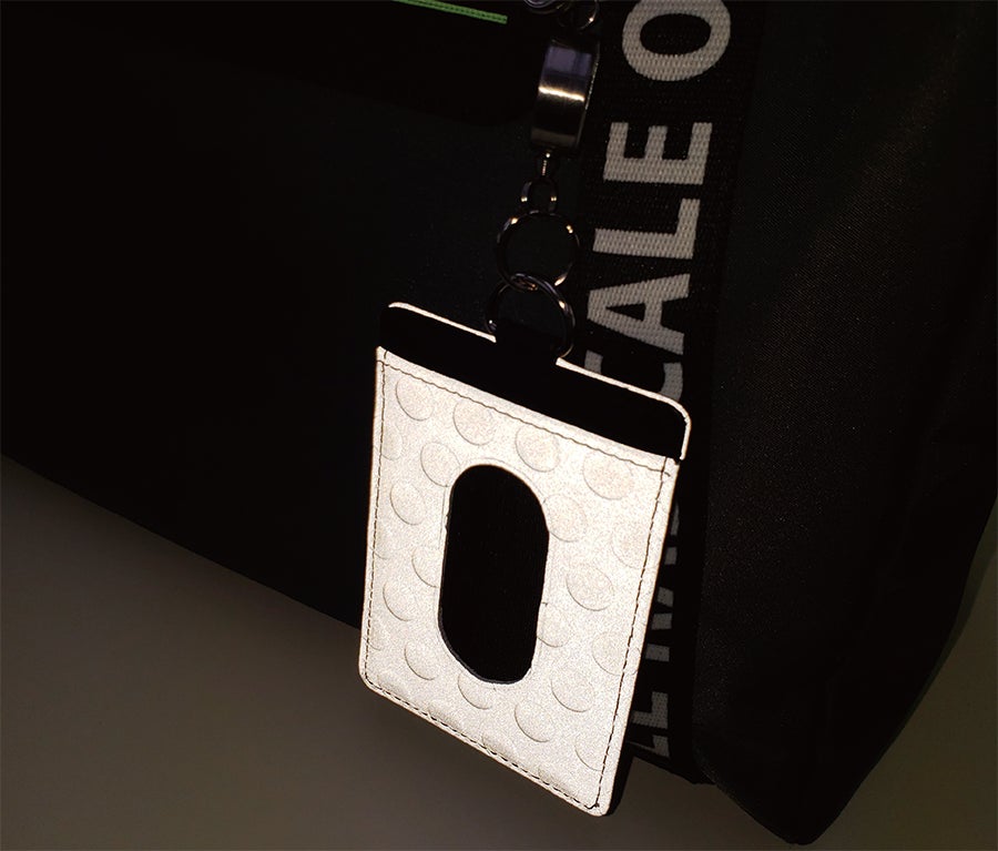 パスケースはバッグにぶら下げて使えるので、リフレクターの効果を最大限に生かすことができます。