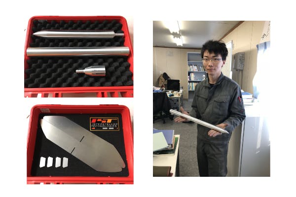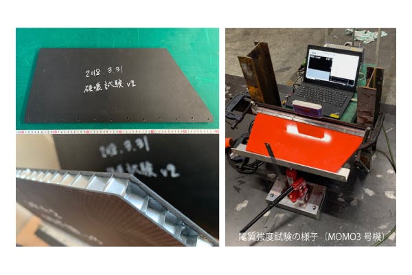 MOMO製作時に行った、尾翼がどれくらいの力に耐えられるかを知るための強度試験に使用した実機と同じ材質、構造の実験用尾翼です。試験データとともにお送りいたします。MOMO2号機の時の物とMOMO3号機の時のものがあります。