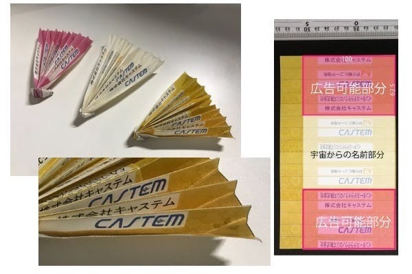 宇宙から飛ばす折り紙飛行機上面に広告を載せることができます。ただし、機体上面(200mm✕139mm)の中央(100mm✕75mm)の部分は宇宙からの名前に使用いたしますので、広告として使用できるのは、残りの外側の部分2ヤマと最外部の両翼端部(100mm✕62.5mm)になります。今回は一機ずつ、合計2口、2機分を募集いたします。