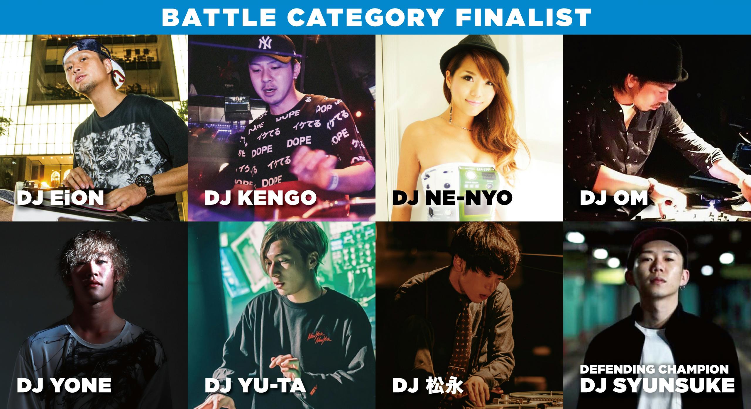 2019/07/30 19:588/24(土)にWOMBLIVEで開催される決勝大会に出場する選手が出揃いました。次はバトル部門のファイナリストを紹介します。DJ EiONヒップホップを軸に名古屋を拠点として活動する愛知県内では数少ないターンテーブリスト。バイブスを前面に押し出したバトル気質なスタイルを武器に、昨年のDMC JAPAN FINAL バトル部門にて準優勝に輝いた経歴も持つ見た目も中身も単純一途な強化系。精力的かつ継続的に地元愛知を中心としたDJ出演や日本各地でのバトルにも出場しつつ、名古屋市内のClub Lover:zにて2ヶ月に1度、ダンサーを主体としながら各地からDJ、ビートメーカーなども招き開催するイベントHot Meat Pieを主催。令和に年号が変わり、かれこれ8周年を迎えたがまだまだのらりくらり続けようと画策中。今年はより一層のうまい飯とうまい酒をいただくべく優勝を狙う。DJ KENGO1989年埼玉生まれ埼玉育ち。高校生の頃にとあるアーティストの楽曲のイントロで奏でられていたスクラッチの音に魅了されDJに興味を持ち、本屋で偶然出会った教則本(およそ12年経ってからその本の筆者の1人がDJ BUCK$だと知る)を手にしたことをきっかけにDJを志しはじめる。その後、ターンテーブリズムやDMCの存在を知り、2008年にDJキャリアがスタート。以来、渋谷を中心にクラブDJとしても活動していく中で、現場の厳しさに揉まれ、憧れていたターンテーブリストとしての姿すらも幻となりつつも、ある出来事をきっかけに軌道修正しターンテーブリストとして遂に本格始動。2017年にDMCに初参加。3度目の挑戦となる2019年にバトル部門で待望のファイナリストとなる。ターンテーブリスト大国、埼玉048の残党ターンテーブリスト。DJ NE-NYO2007年、クラブDJとしてのキャリアをスタート。ターンテーブリズムに魅了され、2012年に単身渡米。LAの様々な音楽シーンを経験し、数々のDJバトルにも精力的に参加してきた。男勝りのプレイを披露し続け、DJとして活躍の場を広げ、自らもLAダウンタウンでのパーティー、ROCK STEADYを主催する。D-Styles、Rhettmatic、Ras-G、StarRo、P-trixなどの豪華メンバーをゲストに迎え、更にDJ Koco、SPIN MASTER A-1などの日本人DJも出演。日本とLAを結ぶ架け橋的な役割も担ってきた。帰国後にはRas-GやD-Stylesの日本ツアーを企画するなど、オーガナイザーとしても活躍している。また2018年にはルーブル美術館アブダビでおこなわれたターンテーブルオーケストラの一員にも選ばれた。DJ OM大阪府出身。地元の友人がスクラッチをしていたのを目撃してDJに興味を持ちターンテーブルを購入。師でもあるDJ KENTAROに魅了されターンテーブリスト道を追求し続けている。DMCには2013年から挑戦。他にもGRIND DJ BATTLEやKAMIKAZE DJ BATTLE、AUTOBAHN DJ BATTLEなど、さまざまなバトルに出場しスキルを磨いてきた。シングル部門では惜しくも決勝進出は果たせなかったものの、前年に続きバトル部門でファイナリストとなる。ベースミュージックやロックなどを使ったジャグリングを武器にJAPAN FINALに挑む。DJ YONE1998年新潟県生まれ。高校生の頃にターンテーブルを購入、独学でスキルを身につけ2016年からDJとしてのキャリアをスタートする。 新潟県長岡市を拠点に活動するFreedom galleyのメンバーでもあり、数々のイベントにてクラブプレイやショーケースをおこなっている。ジャンルの壁を超えた独創的なスタイルを武器に、次世代を担うターンテーブリストとしてフロアを魅了する。DJ YU-TADJ IZOHによるDMC WORLD2012のルーティンに大きな衝撃を受けターンテーブルなどのDJ機材一式を購入。その後、DMCへの出場を目指し、2015年から宮島塾でターンテーブリズムの腕を磨いている。またMCバトルで数々の戦績を残してきたラッパーDOTAMAのバックDJも担当している。2016年にDMC地方予選に出場をして以降、コンスタントにDJバトルに参加。令和元年の今年、3度目の挑戦にして念願のDMC JAPANバトル部門のファイナリストとして決勝大会の舞台に挑む。DJ 松永DJ、トラックメーカー、そしてターンテーブリスト。MCバトル殿堂入りのラッパー、R-指定とのユニットCreepy Nutsとして無尽蔵に活躍中。8月にはメジャーデビュー3作品目となる「よふかしのうた」がリリースされ、テレビ朝日ドラマ「べしゃり暮らし」のOPテーマも担当。ラジオパーソナリティとしては「オールナイトニッポン0」やTBSラジオ「ACTION」などの番組も務める。ヒップホップの現場だけに留まらず、ロックフェスやテレビにラジオと、あらゆるシーンに活躍の幅を広げている中でのDMC参戦。過去幾度となくシングル部門に挑戦しつつも、後1歩のところで日本一を逃してきた雪辱を果たすべく、バトル部門へとステージを移して悲願の頂点を狙う。DJ SYUNSUKEレペゼン福岡。18歳の頃に見たDMCの映像に衝撃を受け、ターンテーブリストとして活動開始。ヒップホップを主軸にしたスタイルで、幾つものDJ バトルでチャンピオンに輝いてきた。2018年のDMC JAPAN バトル部門では九州人で初めてとなる日本一の称号を地元福岡に持ち帰