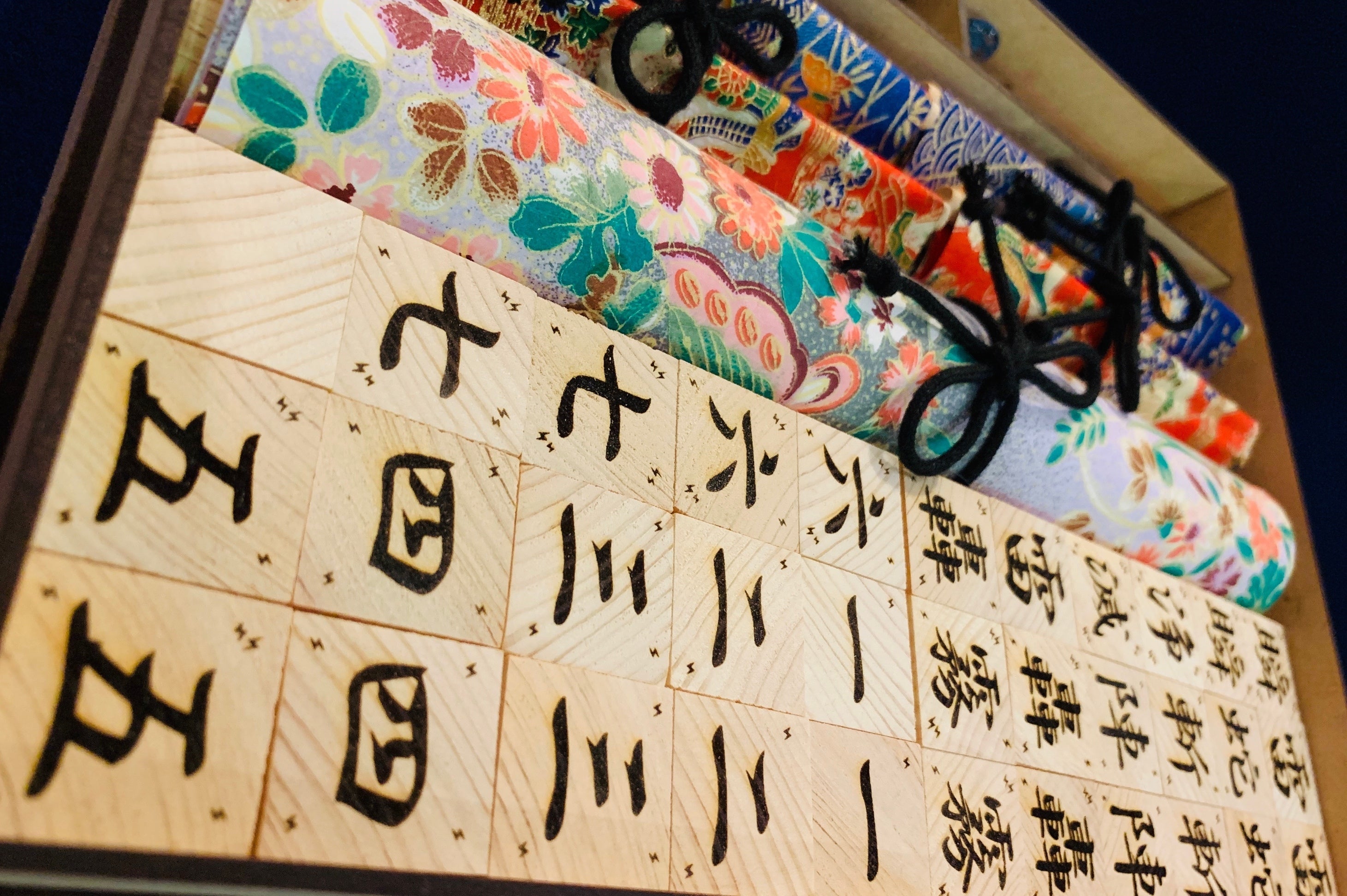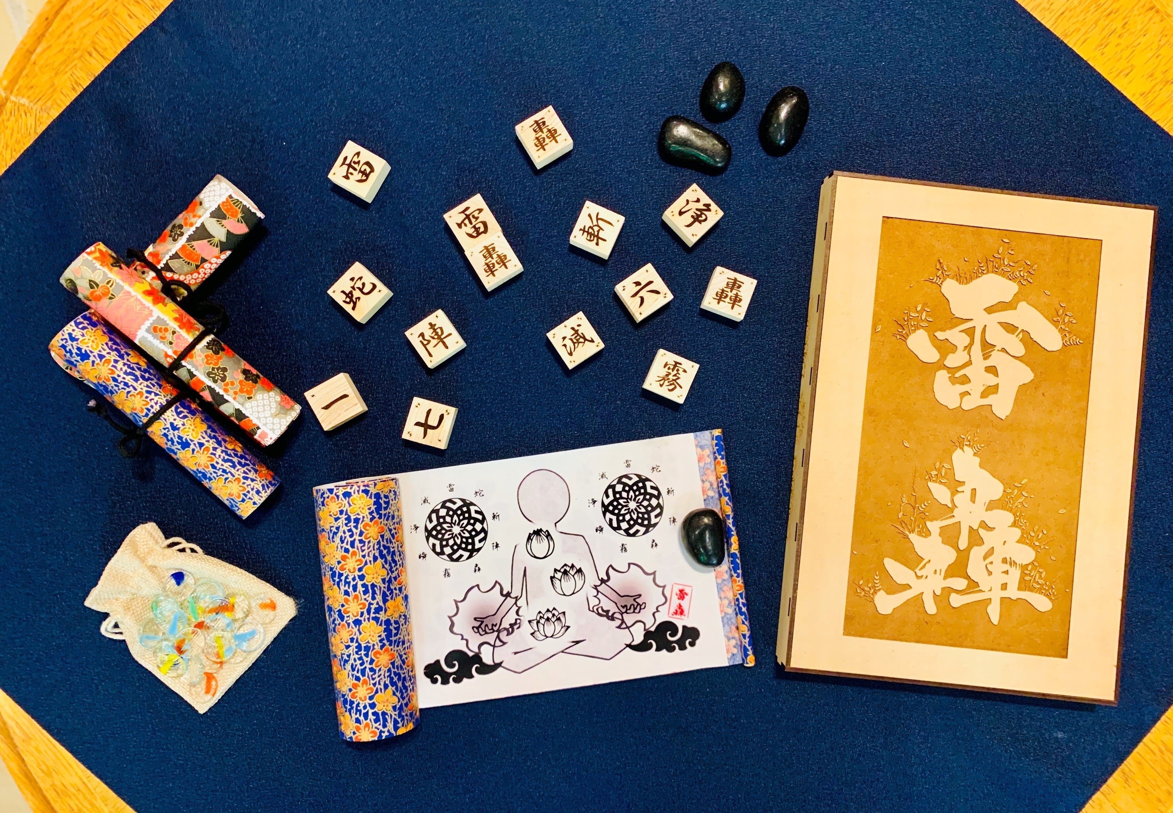 黒)オールハンドメイドのヒノキ駒と巻物が入っています。