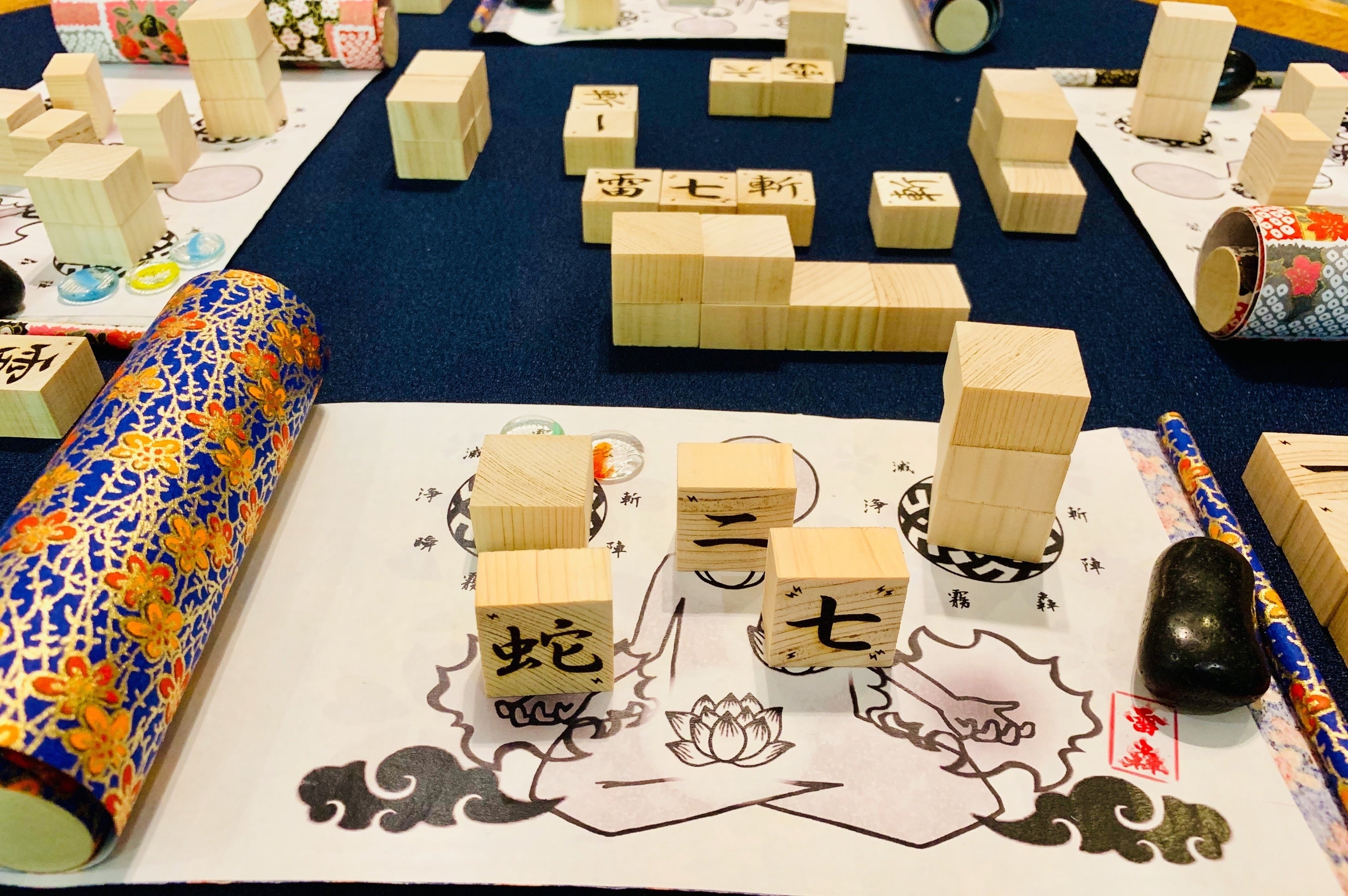 この巻物は、広げてプレイマットとして使用します。赤)駒を1つ1つ切り出して作るのが大変でしたね~。