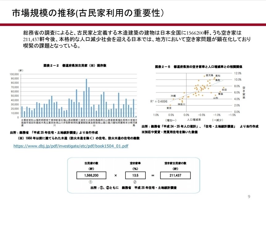 総務省の調査によると、古民家と定義する木造建築の建物は日本全国に1566200軒、うち空き家は211,437軒今後、本格的な人口減少社会を迎える日本では、地方において空き家問題が顕在化しており喫緊の課題となっている。
