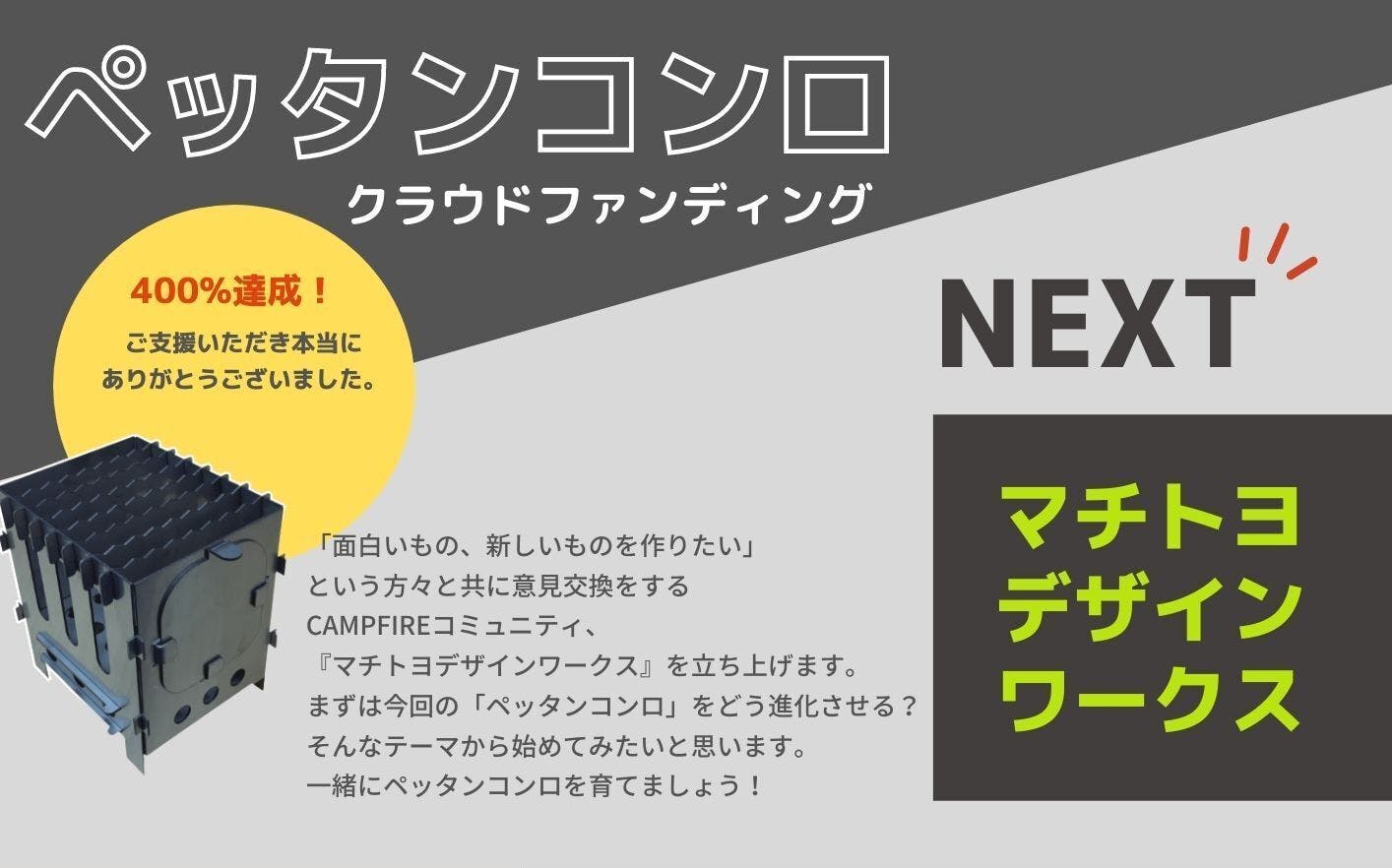 2021/05/24 19:02皆様、こんにちは。株式会社 MACHICOCO 代表の戸屋です。[ペッタンコにする新発想!1 分で組み立てるお一人様用ミニコンロ「ペッタンコンロ」]商品はお手元に無事届きましたでしょうか?ご支援頂きました皆様、応援くださった皆様、ありがとうございました。改めてお礼申し上 げます。★以前ご案内しておりました「ペッタンコミュニティ」は「マチトヨデザインワークス」 に名前を変更し 6 月よりスタートします! ●ペッタンコンロ誕生のきっかけ ペッタンコンロは昨年末頃に豊里金属工業の岩水社長が「これよくない?」と弊社に持ってこられた事がきっかけで商品化しました。これだけのクオリティで作ったのをここだけで終わらせるのはもったいない。そう思い、商品にしようと企画したことが経緯です。写真:ペッタンコンロ×産みの親、岩水社長 ●一緒に商品を「育てる」コミュニティがあったら面白い! 年末から商品化しようと話を進めてきましたが、さぁこれからという時に緊急事態宣言が発出されました。またステイホームを余儀なくされる事で孤独になる人が出てくる。何か私たちが力になれる事はないかと考え始めました。そして出てきた案が、ペッタンコンロを通じてみんながコミュニケーションを取れる場所を作るのはどうか?というものでした。一つの町工場から出てきたアイデア商品。この商品にはお客様のニーズやご意見がもっともっと反映されるべき。このペッタンコンロを使って頂く皆様と意見交換しながら一緒に商品をより良いものに育てていく。そんなコミュニティを作ると面白いのではないか、ペッタンコンロを通じて人と人が繋がるきっかけが作れるのではないか?そう考え、『ペッタンコミュニティ』を作ることになりました。 ●ペッタンコミュニティ→マチトヨデザインワークスへ進化!そしてクラウドファンディングにて皆様にご案内することに。クラウドファンディングの 期間中にこのコミュニティをお伝えしていたら様々なご意見を頂くようになりました。・ペッタンコンロだけではなく、商品作りやアイデアの意見交換できる場があるといい。・作りたいものがあってもどこに依頼して良いかわからないから相談できる場があるとい い。・町工場の職人さんに技術的な知識を教えてもらえるところがあるといい。このような意見を受け、岩水社長とも相談し、コミュニティの内容を考え直した結果、ペッ タンコンロにテーマを限定せず意見交換できる場にしようという話に。名前も「ペッタンコ ミュニティ」から「マチトヨデザインワークス」に変更することとなりました。そんなわけで...オープンを控えたマチトヨデザインワークスのご案内です♩ ~~~~~~~~~~~~~~~~~~~~~~~~~~~~~~~~~~~ 【マチトヨデザインワークス】 「町工場と一緒に創ろう!ものづくりのアイデア育成コミュニティ」 限定公開 URLhttps://community.camp-fire.jp/projects/382410/preview?token=2ltur4eh~~~~~~~~~~~~~~~~~~~~~~~~~~~~~~~~~~~ ★コミュニティでできること★○ Facebook 非公開グループ「マチトヨデザインワークス」でものづくりのアイデアをシェアして意見交換できるコミュニティに参加し投稿、コメントできます!マチトヨからは面白い製造の事例や、それに関わる技術的なお役立ち情報を日々投稿します。コミュニティ メンバー限定イベントご案内も♩○ 材料や工法、工場への製造相談の仕方が学べる非公開ページで、材料の特徴や選び方に関する情報、工法について、工場に製造依頼する時に必要な情報や、量産までの進め方など...作りたい人に役立つ記事や動画を随時ご覧いただけます。○ マチトヨと ZOOM で話そう!オープン企画会議に毎月参加。コーディネーターの戸屋と、職人の岩水(イワミー)に直接質問できる月一の zoom 交流会にご参加いただけます。マチトヨデザインワークスでの第一弾のディスカッションテーマはもちろん「ペッタンコ ンロ」。リターンとしてお買い上げ頂きました皆様と意見交換をしていきたいと考えている次第です。コミュニティにご参加いただき一緒にペッタンコンロをもっとブラッシュアップさせていきたい!!そう思っているところです。 豊里金属工業は設計から製造まで提案できる企業。普段から当たり前のように開発案件をこなしています。そんな彼らだからこそ意見をどしどしぶつけていきたいと思います。私たち MACHICOCO はディレクターとして、皆さんのアイデアを未来に繋ぐ面白い企画をたくさん考え仕掛けていきます!皆様と新しいモノ、コトを創り出せる事を楽しみにしております。 マチトヨデザインワークス、ぜひ!ご参加くださいませ。 【マチトヨデザインワークス】 「町工場と一緒に創ろう!ものづくりのアイデア育成コミュニティ」 限定公開 URLhttps://community.camp-fire.jp/projects/382410/preview?token=2ltur4eh もっと見る