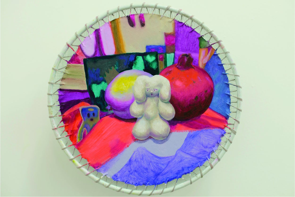 伊藤彩の絵画には、お化けや玩具のようなモチーフが登場しますが、それぞれが、空間がねじれたような不思議な奥行きの中にコラージュされています。彼女はまず、キャンバスのペインティングや紙のドローイング、立体物、布、家具などで実際のジオラマを作り、その作品世界に入り込んでいくのです。そして写真を撮影しながら、平面からは見えない構図や、アングルの視覚的効果を緻密に検討し、実際の絵画を制作していきます。この独特な制作プロセスこそが、中毒性をもって見るものを虜にする作品を生むのです。