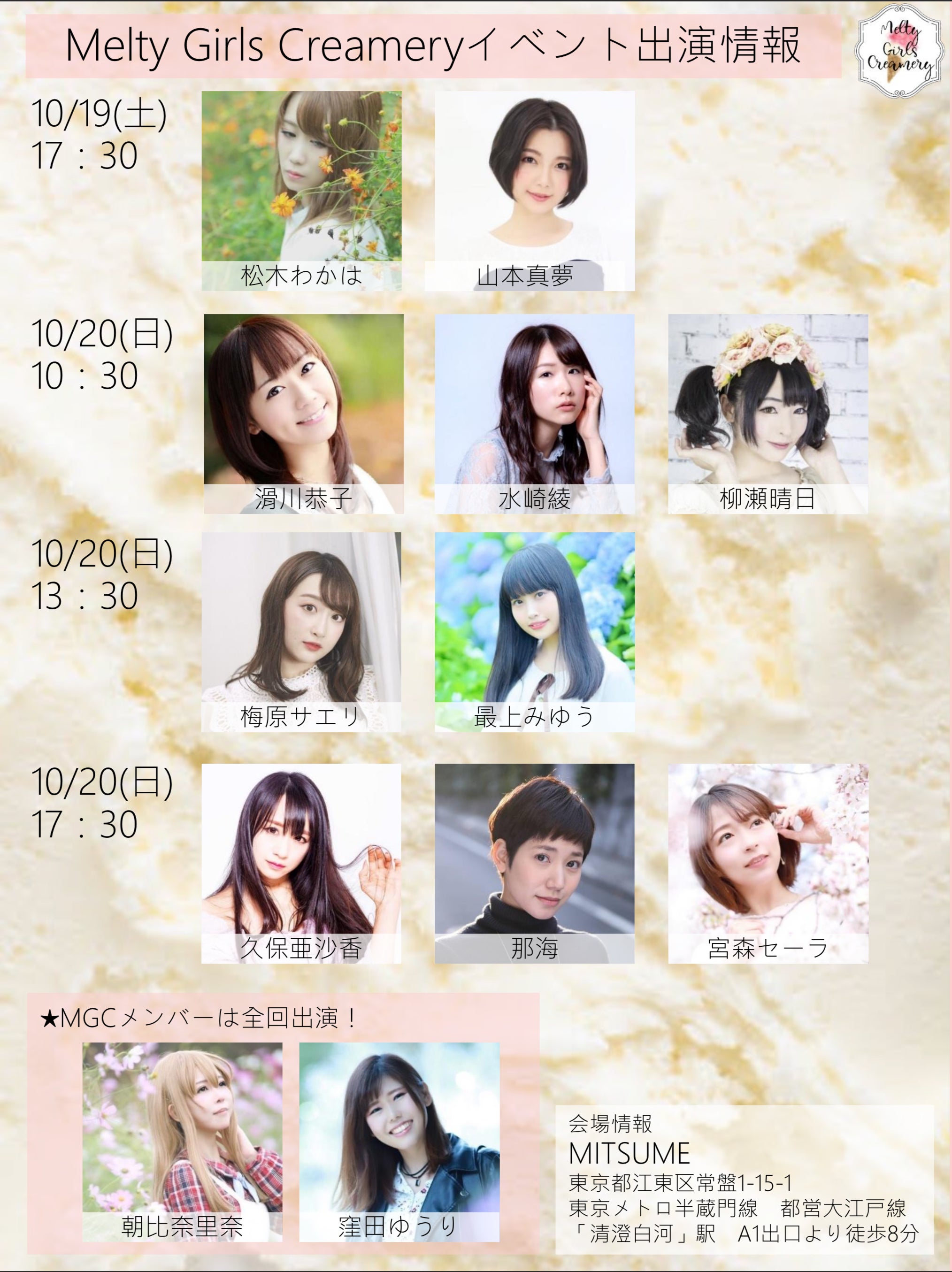 2019/08/07 18:00こんにちは。Melty Girl Creameryスタッフです。10月開催予定のイベント情報 第二弾をお知らせします!大変申し訳ございませんが、会場都合によりイベントの開始時間が全て変更になっています。8/6までにお申し込みが済んでおり参加回の変更希望がある方は、運営までご連絡いただきたくお願いいたします。それ以降の申し込みについては基本的に変更を受け付けませんのでご了承ください。---------------------出演者情報:10月19日(土)17:30◇松木わかはさん&山本真夢さん10月20日(日)10:30◇滑川恭子さん&水崎綾さん&柳瀬晴日さん13:30◇梅原サエリさん&最上みゆうさん17:30◇久保亜沙香さん&那海さん&宮森セーラさん☆朝比奈里奈、窪田ゆうりは全イベント出演します。イベントは各回1時間半の予定です。会場情報:MITSUME 東京都江東区常盤1-15-1東京メトロ半蔵門線 都営大江戸線「清澄白河」駅 A1出口より徒歩8分---------------------イベントチケットの一般販売やイベント・グッズ詳細についてなど、随時発表予定です!引き続きどうぞよろしくお願いいたします。Melty Girls Creameryスタッフ もっと見るオリジナルグッズデザイン発表第三弾!