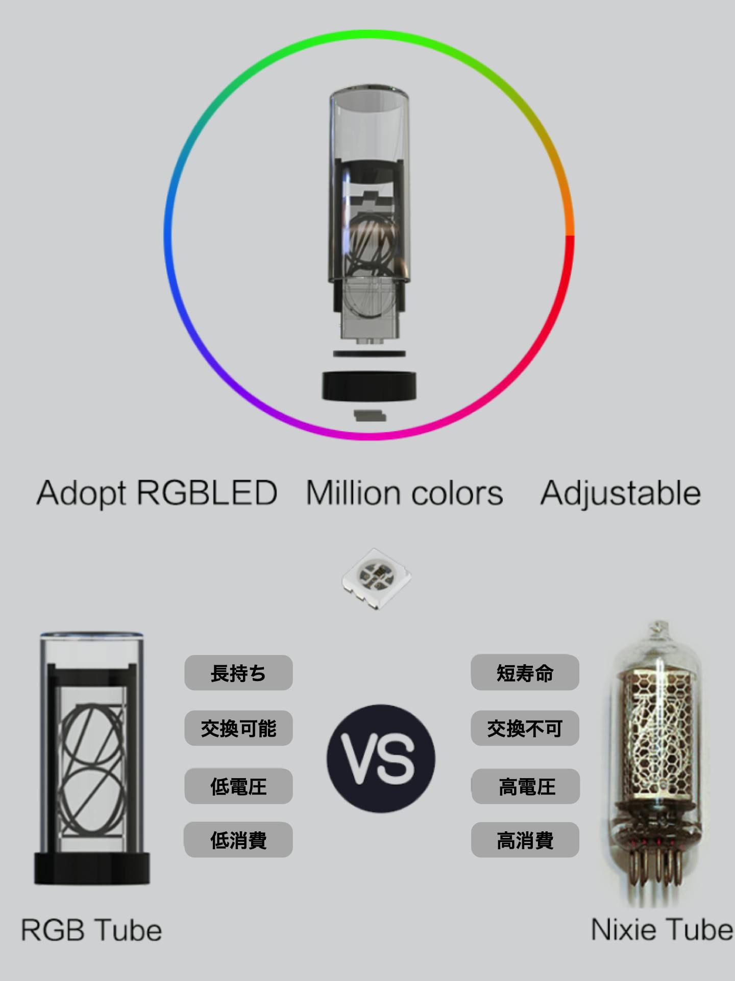 A. 弊社では時計なので時刻に正確かつ壊れにくい製品をできるだけ沢山の方に長くご愛用いただきたいと思い、ニキシー管ではなく、LED仕様のGixie管ですのでご安心ください。