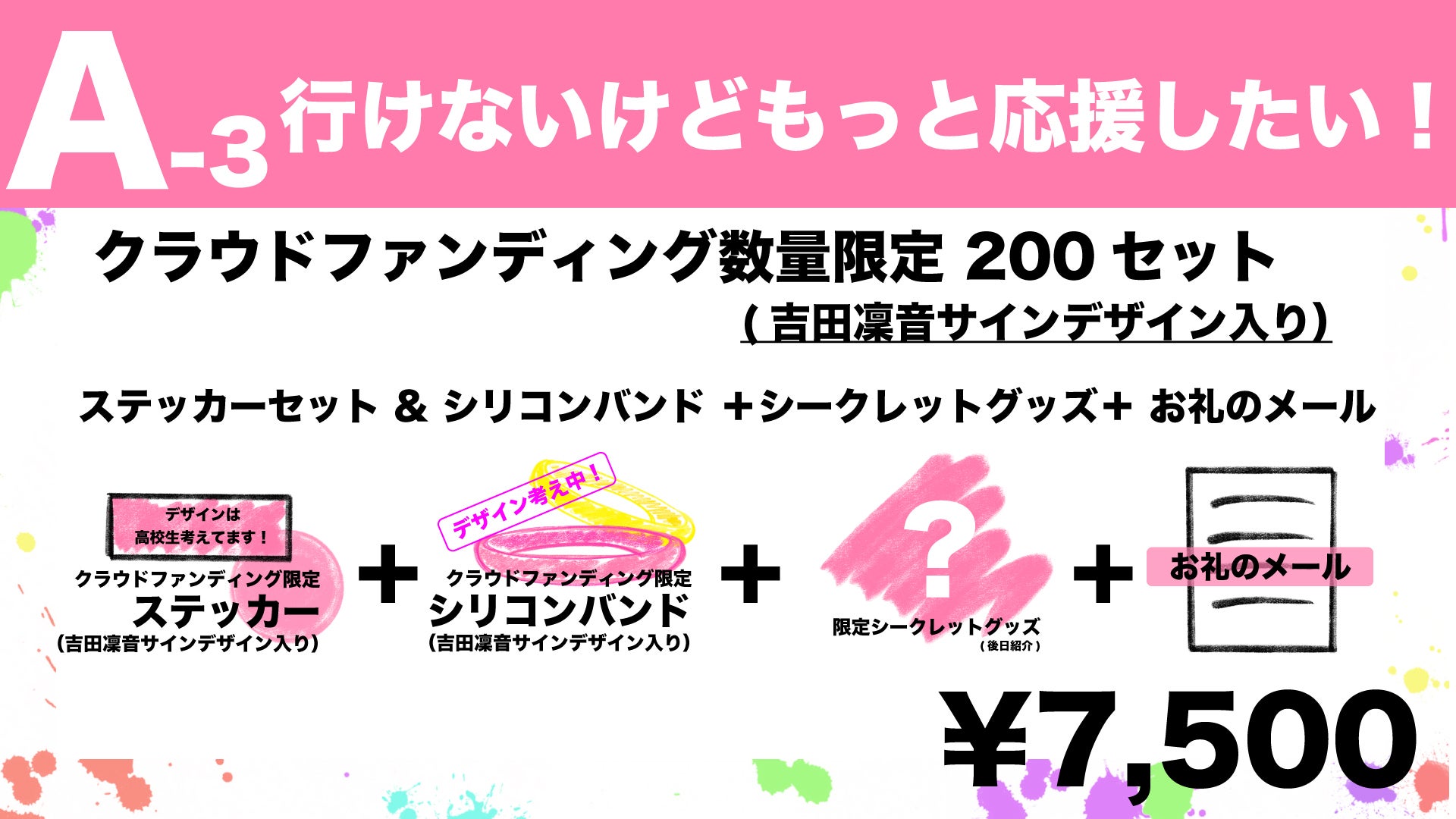 ・・・クラウドファンディング限定デザインで、吉田凜音さんから頂いたサインデザイン入りのステッカーまたはシリコンバンド +お礼のメール (限定100)