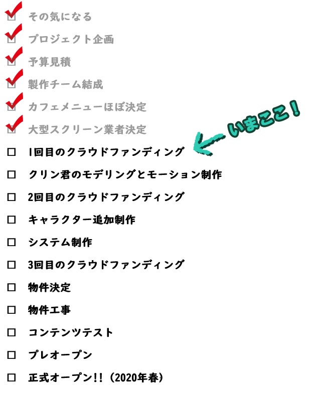 2019/09/19 16:04パトロンの皆さん、こんにちは。すっかり秋が近づいてまいりましたね。とても過ごしやすくて穏やかな気持ちになります♪気温の変化が激しいので風邪にはお気を付けください。さて、LITTLE SQUARE計画は皆さんのおかげで大きな進歩がありました。カフェにやってくる異世界住民第1号「クリン君」が立体(3D)になりましたYO!↓人間に近づいているクリン君↓外注会社になんとか支払いをすることができました♪ (生々しい…)クリンを立体にしてくださって感謝! 益々愛着がわきます。チームの中ではクリン君の動きを作る工程に入っています。 とってもかわいいんですよ♪そして来年春オープンに向けての現在の進捗はこんな感じ。新しい異世界住民の制作にも取り掛かりました。プログラムも必要!ここは自分のコツコツためてきた貯金で、、、そろそろ尽きそうなので大きな支払いは後ろに後ろに回しつつ でも着実に進んでおります!本文で載せていたスケジュールで物件決定と次のクラウドファンディングの順番は入れ替えました。物件を決定して、次回のクラウドファンディングではちゃんと場所をお伝えしたいためです。今回いただいた貴重なご意見の中に「行きたいけど場所がどこか不明なので行けるかわからない」「何が食べれるの?メニューが知りたい」などなど、愛情たっぷりのご指摘をいただきました!次回こそは載せますよー☆来年の頭ぐらいに、もう一の今回以上に素敵なリターンを用意しクラウドファンディングに挑戦したいと思っておりますのでその時も気が向いたら是非応援のほどよろしくお願いします!!PS.今回のリターンに関しては1件ずつ対応中です。 10月以降に届くパトロンの方も 是非楽しみにお待ちください^^ もっと見る今日で最終日!今日は誕生日?!