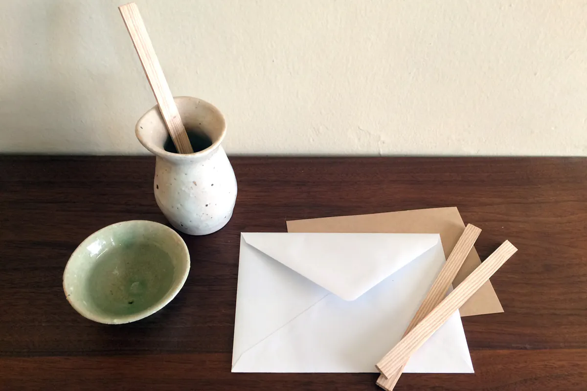 長い歴史のある林業の中で手間暇かけ生産された高級材です。その杉をスティック状にしたものをお礼の手紙に同封させていただきます。まずは封筒を開けて杉の香りを感じてください。