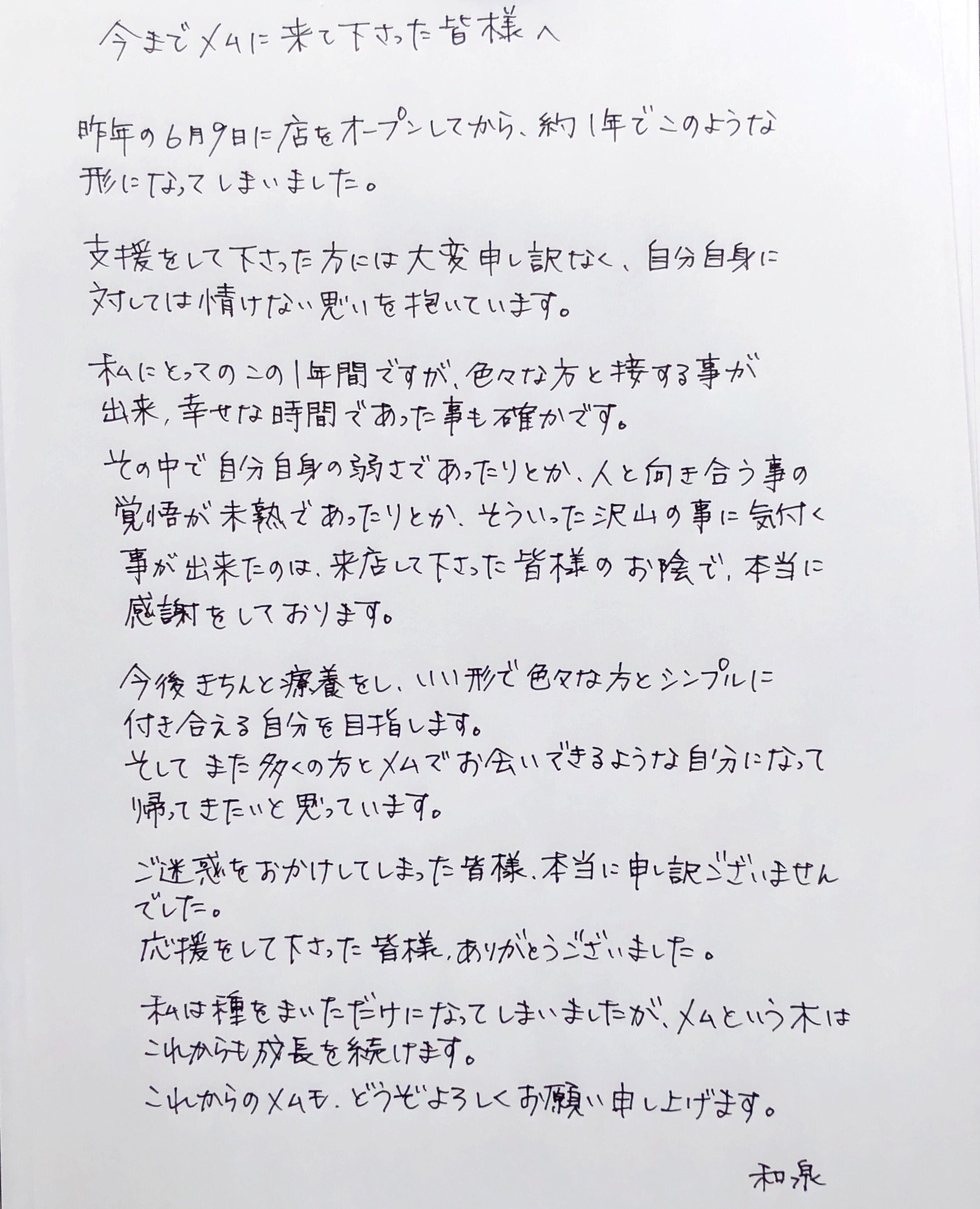 2019/07/17 20:162019年5月13日。ちょっとした事があった。何人かにその話をした。『それを1人で受け止めるのは辛かったでしょう』という方もいれば『事実としてはわかるが、あなた自身も柔軟にならなければ』という人もいた。とにかく、自分の認知が正常ではないという事は認識できた。簡単に言うと、その出来事をきっかけとして私は壊れてしまった。その後の1~2週間の記憶は曖昧だ。メムは無くなるんだろうなぁと他人事のように考え、せめてこの目に焼き付けておこうと、閉め切った誰も居ない店内の客席に1人座り、何時間もぼぉーと青い壁画や入口の木の絵を眺めていた様な気がする。『この店はもうすぐ無くなる』という思いと『絶対に無くしては行けない』という気持ちがせめぎ合い、しかし『自分が続けるのは無理だ』という事だけが事実として横たわっていた。そんな時にkarmaさんに連絡をした。その時はkarmaさん・こーさんに店を継いで貰おうという所までは想定していなかった。世の中そんな都合よく動くものではない。何故karmaさんに連絡したのか。その時は衝動だったのだが、今ではわかる。karmaさんは私の知っている中で1番強い人だからだ。karmaさんに赤裸々に想いを伝えた。『この店を潰さないですむ方法を一緒に考えて欲しい、出来ればこーさんも巻き込みたい』と。彼女の返事は『ちょっと待ってね』待ったのは30分位だったろうか。返事が来た。『和泉さーん、私とこーさんとでメムやる事になったから』声を上げて泣いた。わんわん泣いた。ぐちゃぐちゃに泣いた。メムは存在する事になった。世の中は都合よく動いたのだ。今回、1度壊れた私自身の修復を優先させて頂いた為、リニューアル工程にはあまり関われたかったが、制約のある生活を送る中で出来るだけkarmaさん・こーさんとの連絡は取れる体制だけは整えていた。クラウドファンディングの経過も、タイムラグこそあっても状況の把握には努めていた。今現在の流れに、正直驚いています。勿論、karmaさんとこーさんのプレゼンスキルや、お2人の強みを最大限に活かしたニーズに合ったリターン設定の賜物だと思いますが、大元のコンセプトに賛同して下さった方も多くいらっしゃったかと想うと、本当に『メム』をやって(というか頑張って)良かったなぁと改めて思います。karmaさん・こーさんは勿論の事、新店長の監督さんやスタッフのけいらさん、その他何かあるとお店を手伝ってくれるゆうくんやしゃいさんや、美装担当のありさん、お店にいらっしゃった事のある方だけでなく、興味を持って下さった方、クラファンに御協力頂いた方、そしてここまで読んで下さった方全てに御礼を申し上げます。本当にありがとうございます。私は精神を患ってはおりますが、幸せなのだと今想う事が出来ました。本当にありがとうございます。メムでお会い致しましょう。 もっと見る