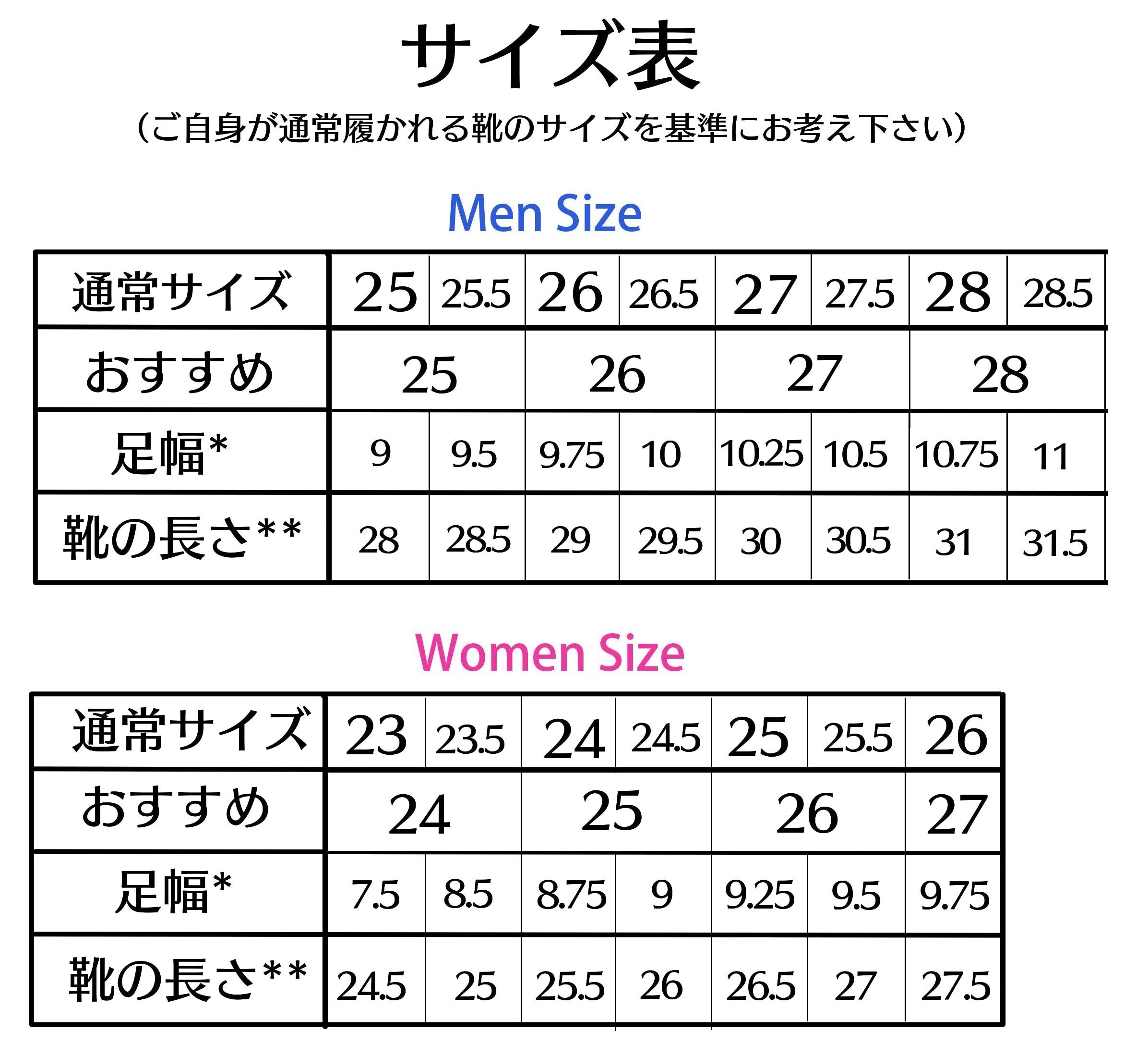 女性用の靴は男性用よりも内側クッションが厚く、ややタイトめに作られていますので大きめサイズをおすすめしております。