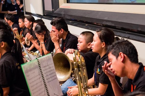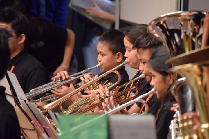 *リコーダーや鍵盤ハーモニカで基礎を学んだ後、オーディションに受かるとオーケストラの一員として楽器を担当する。これが子どもたちにとって大きな目標となっている。RJは現在トランペットを担当。