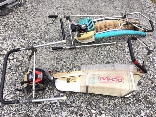 ・農機具類。右上から時計回りに「裾刈り機」・「エンジントリマー」・「刈ナラシ機」・「茶摘み機」