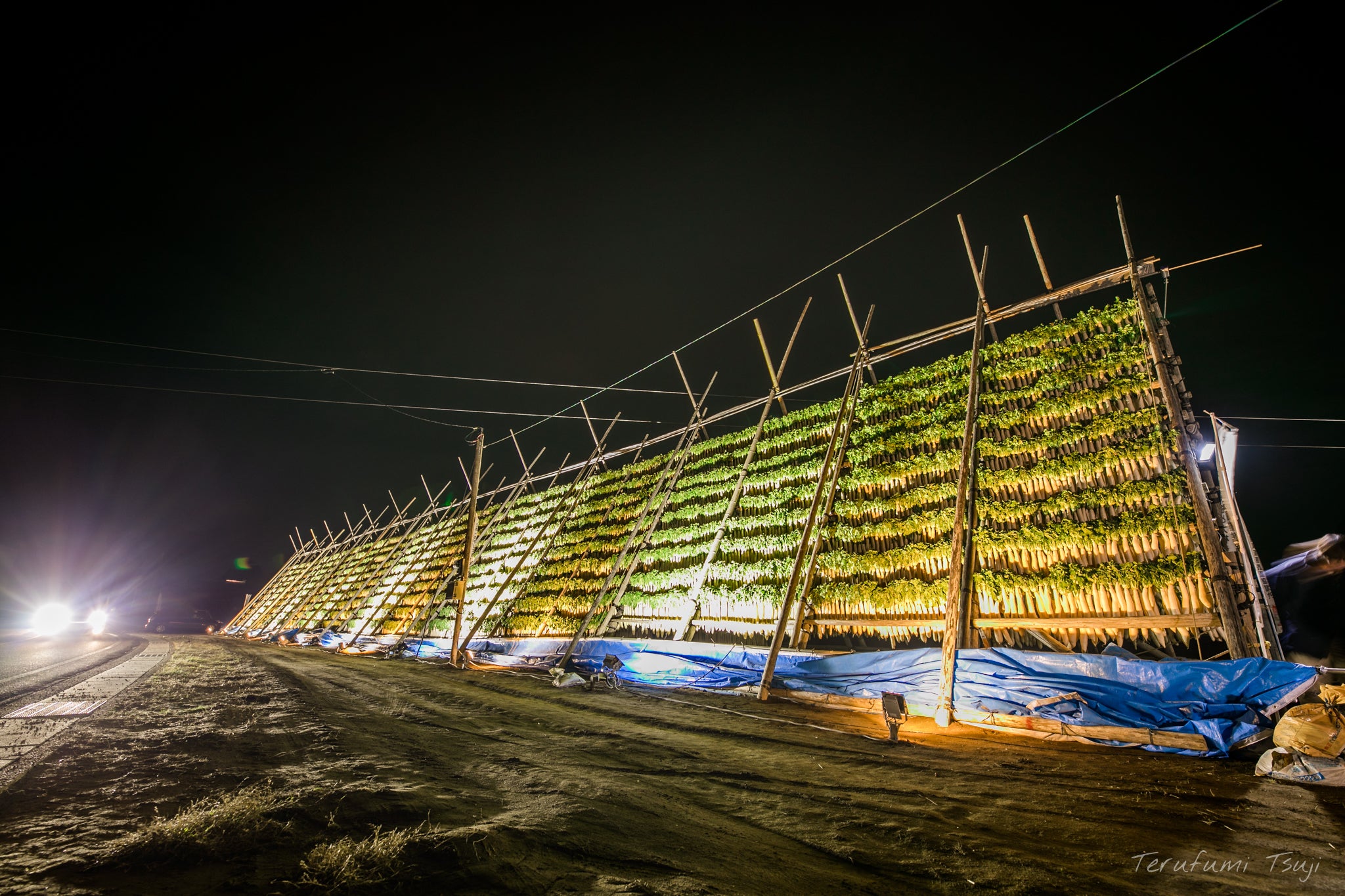 ブルーシートで覆われた大根やぐら降雨の時と気温が0度になるような時にやぐらをブルーシートで覆う。(雨が当たると菌が発生し大根が変色するため)気温が0度を下回る時は、やぐらの中でストーブなどの暖房を焚いて干し大根が凍るのを防ぐ。【大根が凍ると、品質の低下を招く。】高さ6m×幅6m×長さ50mのやぐらで、干し大根が約30a分の大根が干せます。