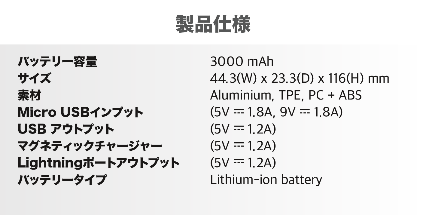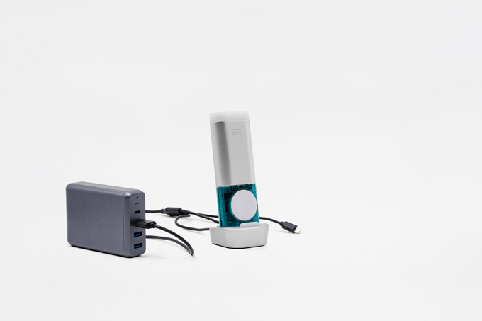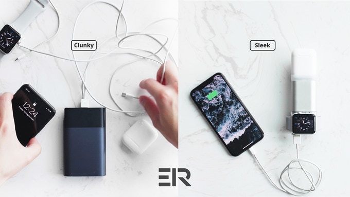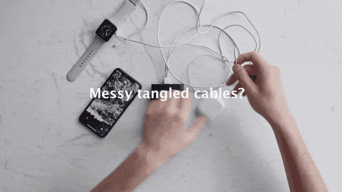 一般的なモバイルバッテリーは、大きくてかさばり、充電ケーブルが必要で、なにかと取り扱いに苦労します。不格好なバッテリーと、Apple Watch用の長い充電ケーブル、さらにAirPods用のLightningケーブルを持ち歩くのは、スタイリッシュでも、ポータブルでもありませんよね?