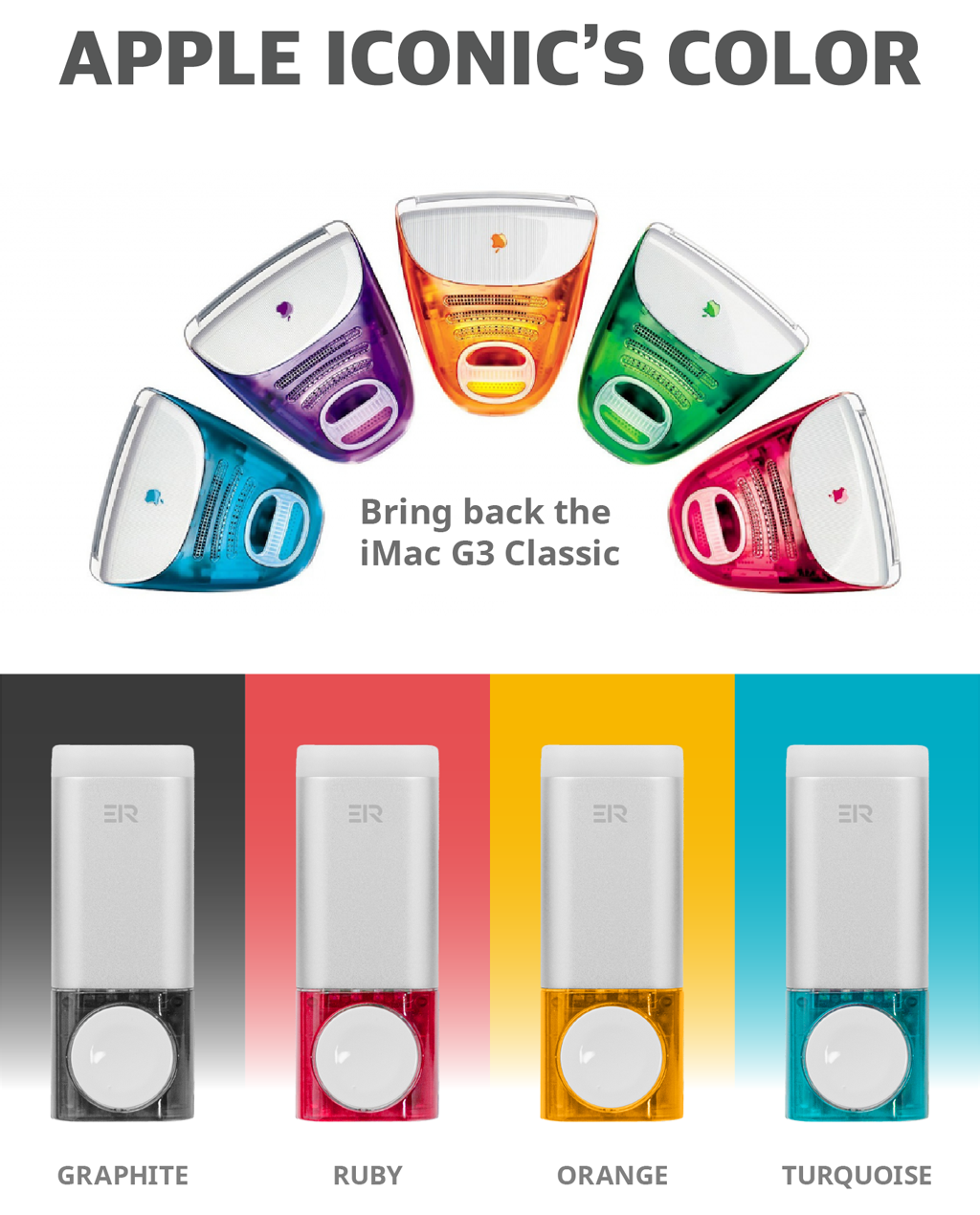 Appleファンのために:伝説のG3 iMacの20周年を記念して、EIRTOUCHにもクラシックな半透明カバーを着せてあげることにしました。カラーは、Graphite(グラファイト)、Turquoise(ターコイズ)、Ruby(ルビー)、Orange(オレンジ)の4種類。最先端バッテリーに、Appleの歴史を着せて出かけましょう!