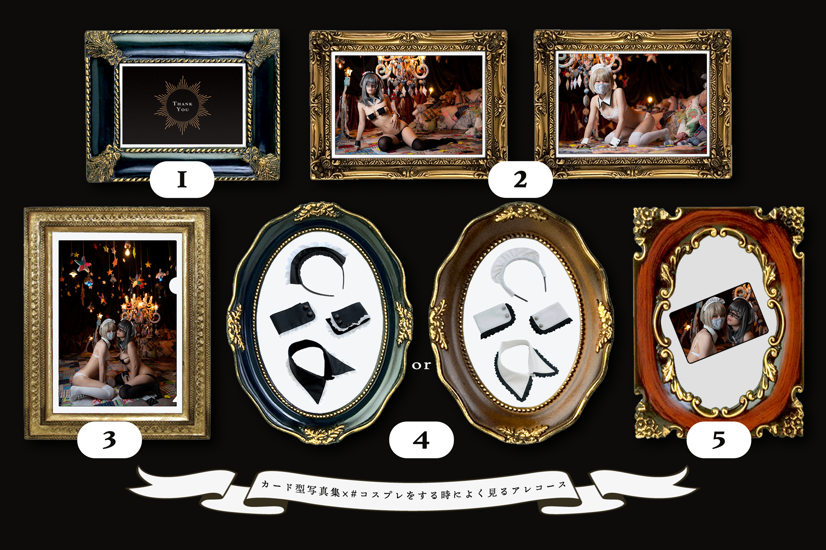 ❶ オリジナルお礼状 ❷ 限定ブロマイド 2枚 ❸ クリアファイル 1枚 ❹#コスプレをする時によく見るアレ 1セット ❺ 限定カード型写真集