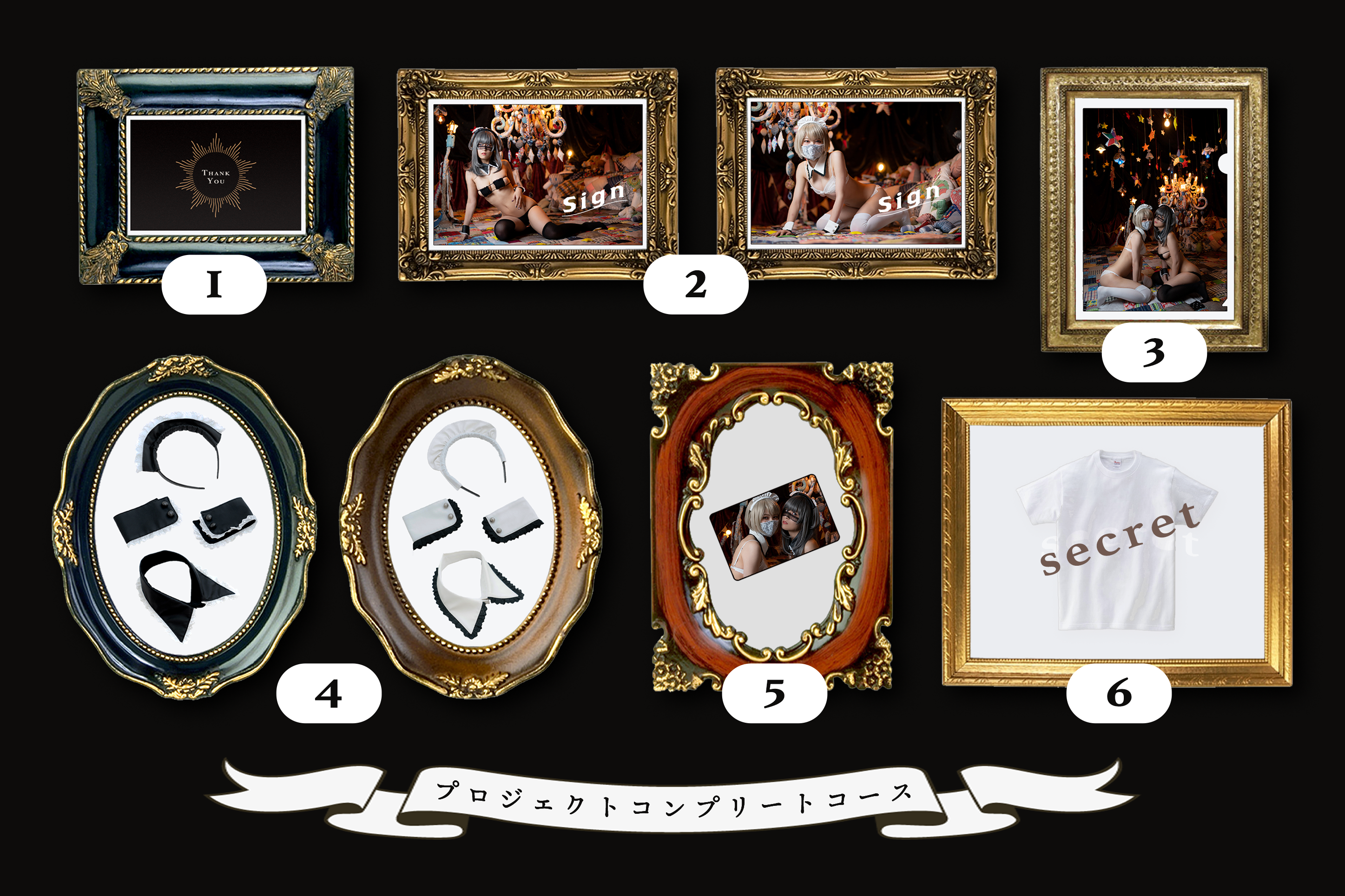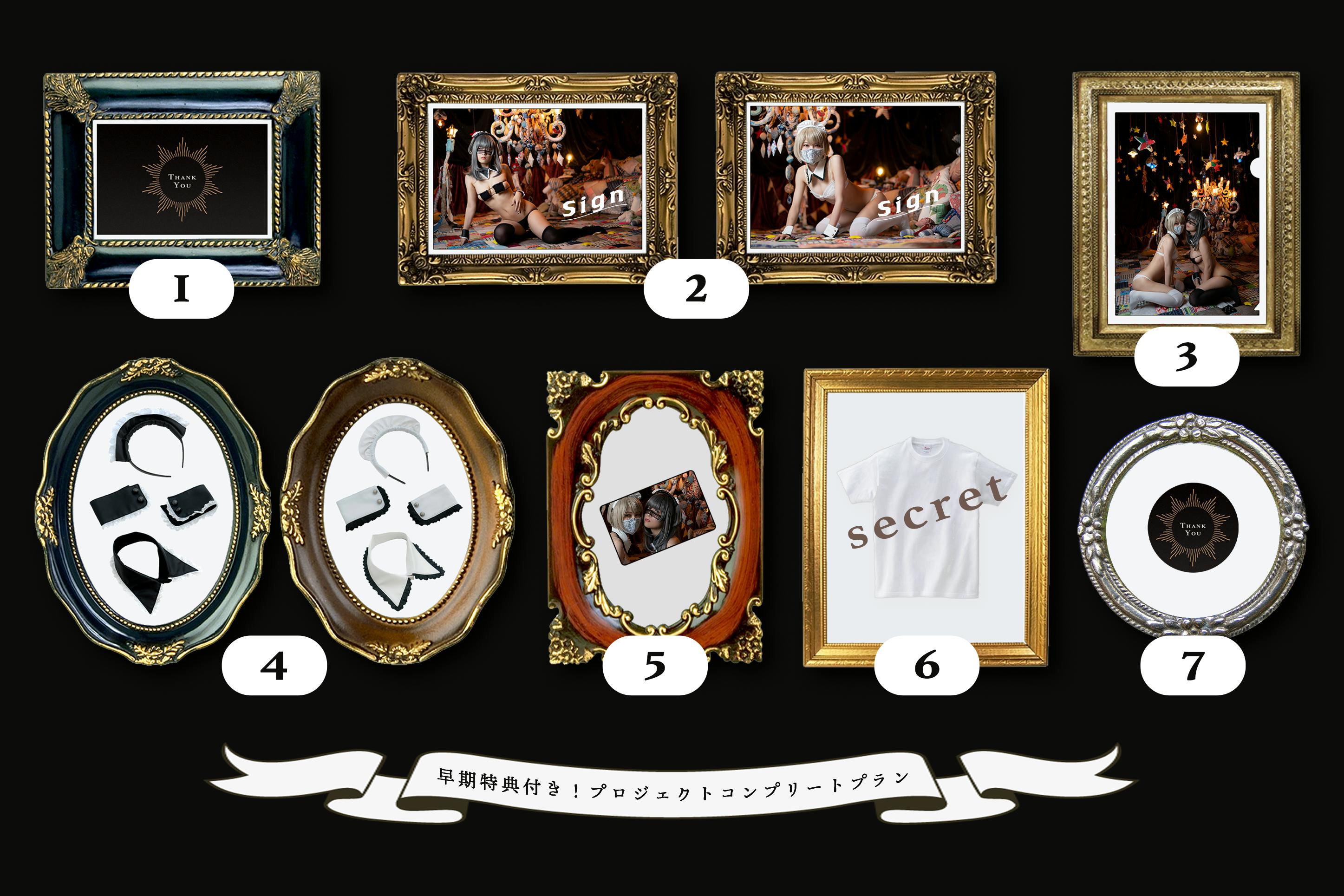 盛り沢山のコンプリートプランです!「#コスプレをする時によく見るアレ」が2セットや、写真集、オリジナルTシャツなどが全部込み込みであなたのもとに!なんと限定ブロマイドは直筆サイン入りとなっております。ファンの方には堪らないコースです!