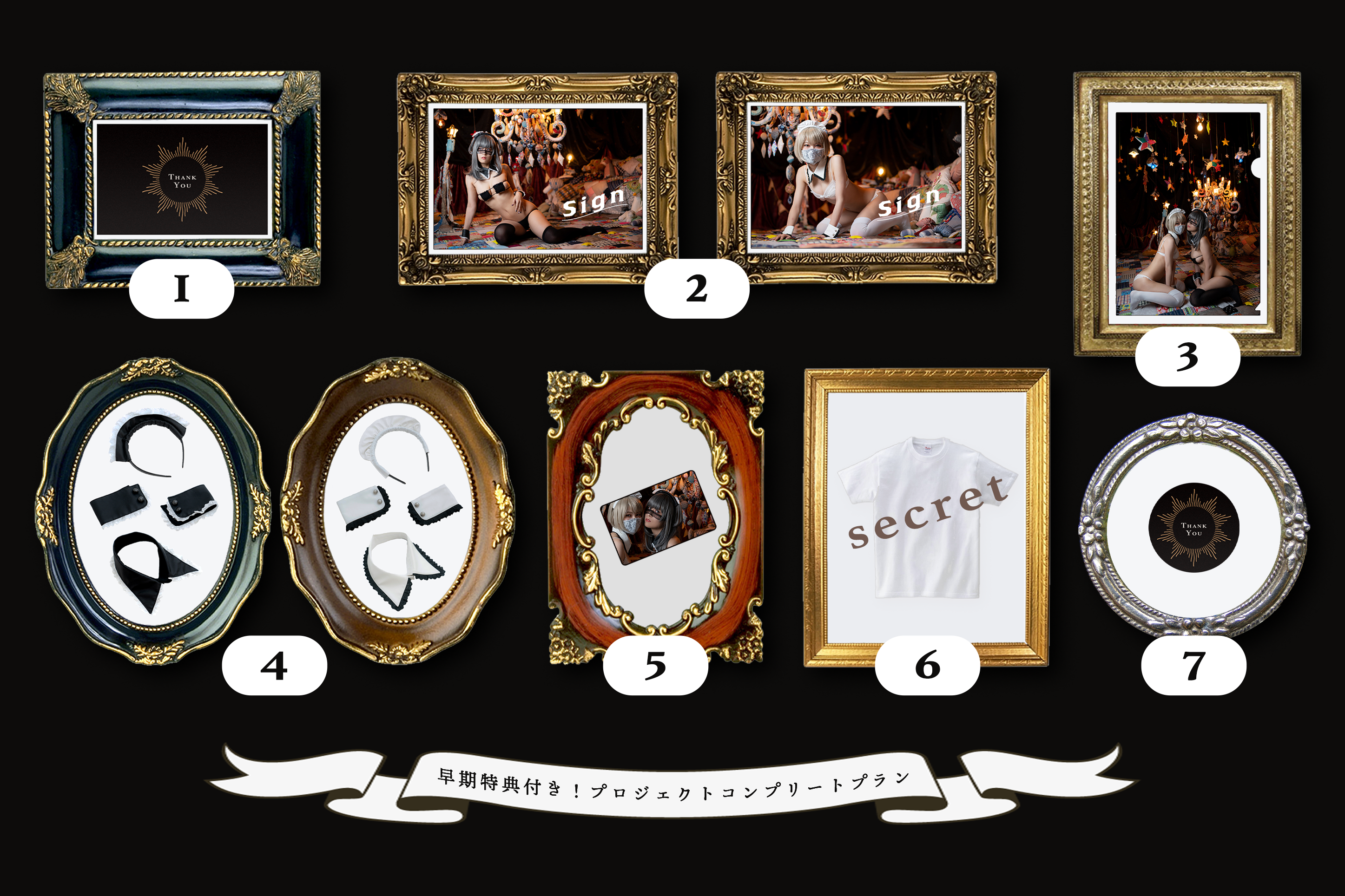 ❶ オリジナルお礼状 ❷ 限定サイン入りブロマイド 2枚 ❸ クリアファイル 1枚 ❹#コスプレをする時によく見るアレ 2セット ❺ 限定カード型写真集 ❻ オリジナルTシャツ 1枚 ❼ オリジナル缶バッジ