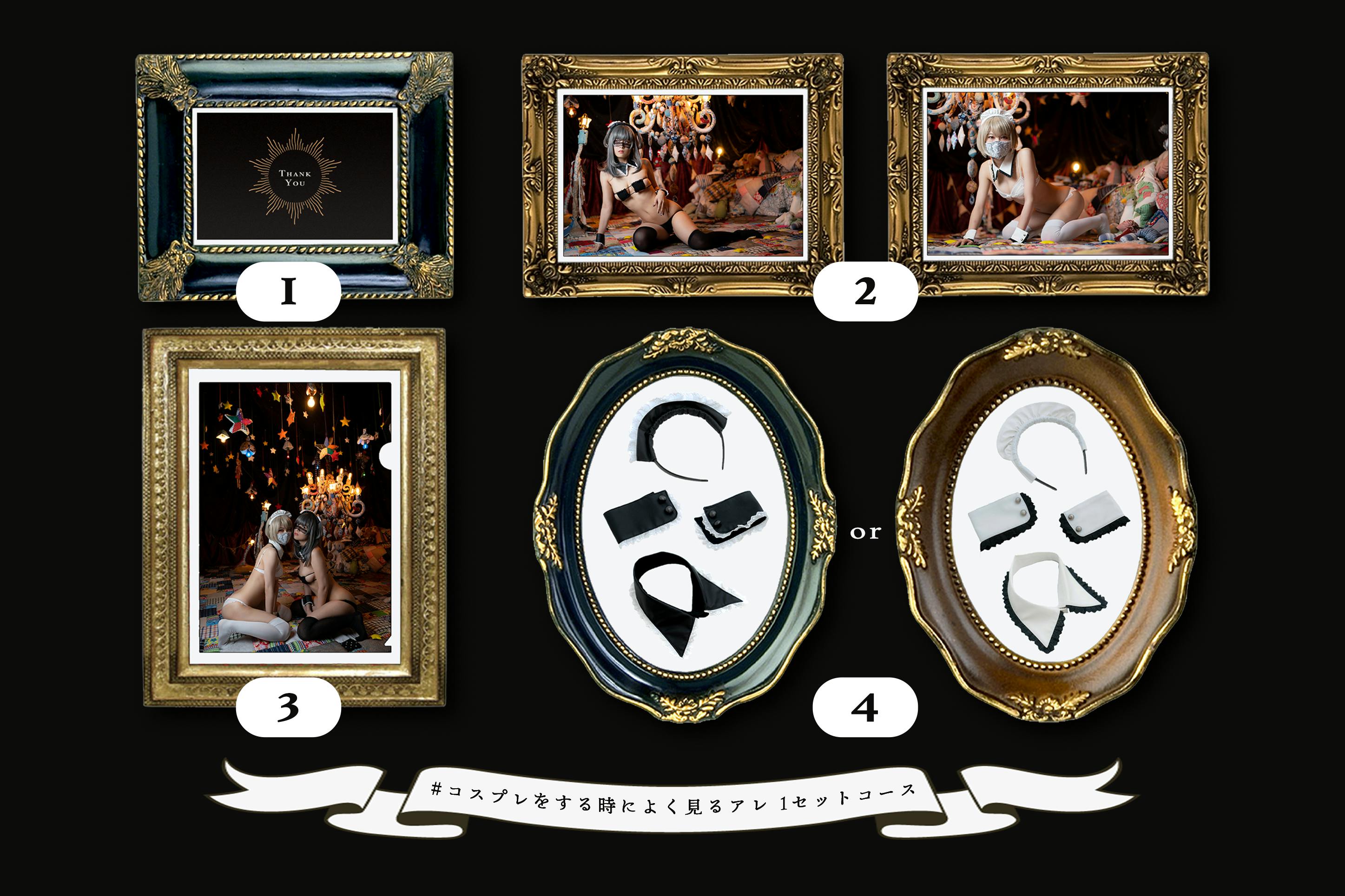 ❶ オリジナルお礼状 ❷ 限定ブロマイド 2枚 ❸ クリアファイル 1枚 ❹ #コスプレをする時によく見るアレ 1セット