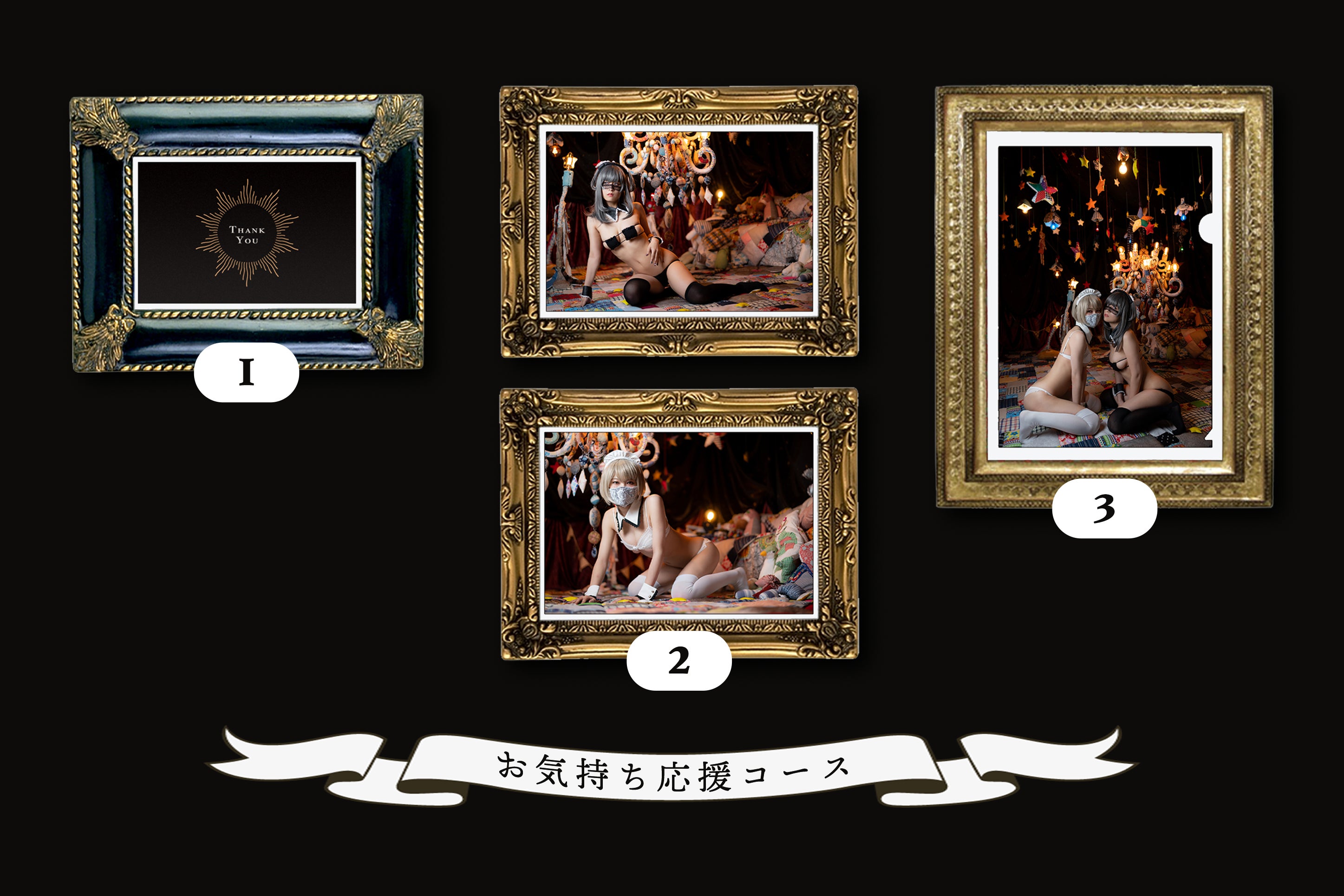 ❶ オリジナルお礼状 ❷ 限定ブロマイド 2枚 ❸ クリアファイル 1枚 ❹#コスプレをする時によく見るアレ 2セット
