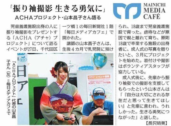 代表山本昌子(プロジェクト設立者)自身、生後4ヶ月から施設で育てていただくという生い立ちを歩み、長い施設生活の中で一番大変だったのは卒園した後の18~21歳頃だったと感じています。学費に生活費、全部を自分でやりくりしなくてはならない日々に金銭面も大変でしたが、何よりも精神面でも孤独との戦いでした。はっきり言って生きている意味も、自分が生きているのかもわからなくなるような日々でした。そんな中で多くの方々に支えていただきました。その中のひとつに、ある知人の方に成人式の振袖を着ての後撮り撮影をプレゼントして頂きました。それと同時に「自分は大切にされる存在だということを感じてほしい」とのメッセージも頂きました。そのことが私自身の生きる勇気に繋がったと感じています。そのために同じ境遇の子達を、自分が一番辛かった時期と同じ時期により支えたいという思いの元、この活動に至りました。そして2016年3月に立ち上げさせて頂き、活動をさせていただいております。