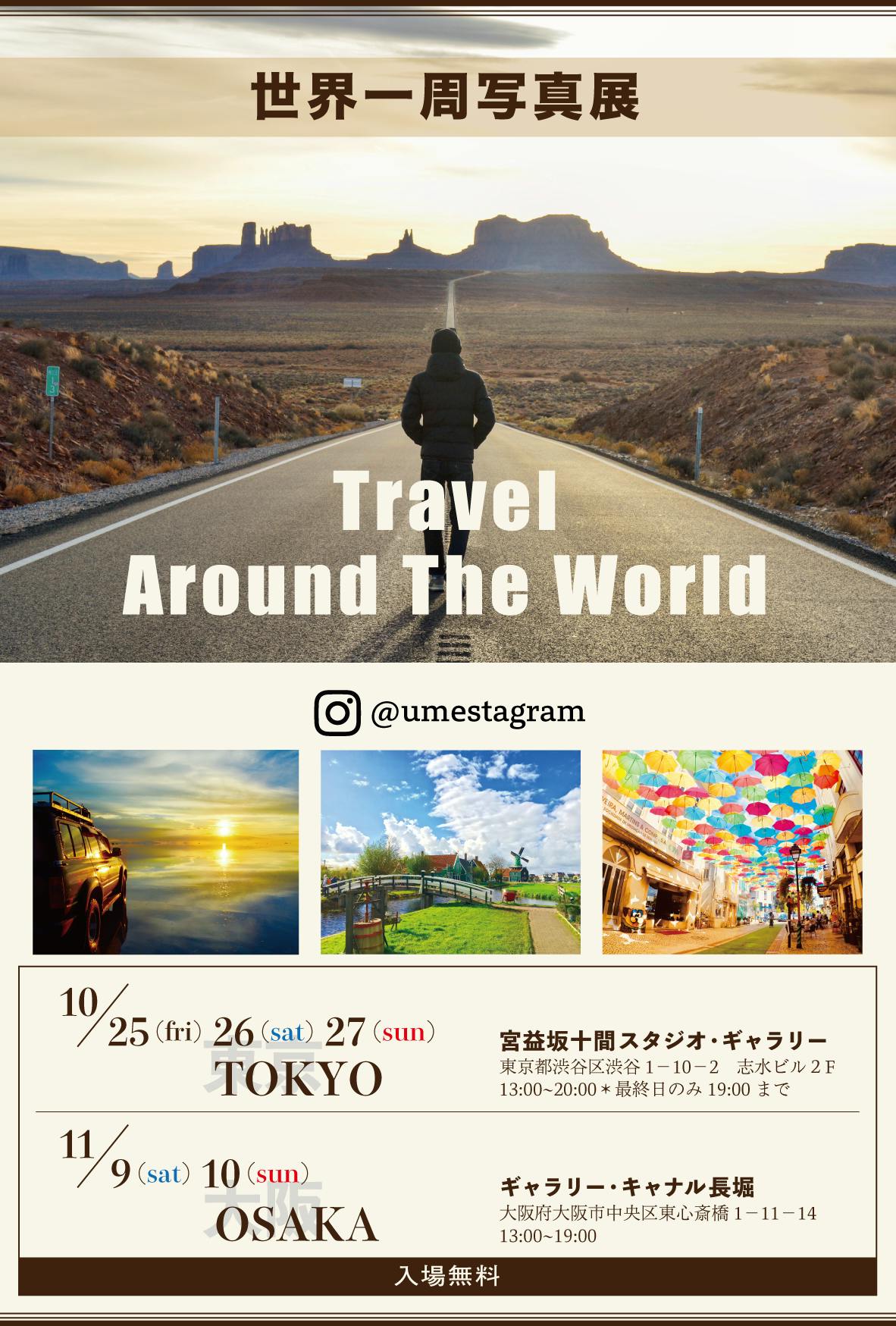 • 写真展詳細について改めてご案内させていただきます!▼詳細「世界一周写真展」【東京】場所:宮益坂十間スタジオ・ギャラリー住所:‪東京都渋谷区渋谷1-10-2 志水ビル2F‬日時:2019年10月25(金) 26(土) 27(日)          13:00~20:00‬ (最終日のみ‪19:00‬まで)【大阪】場所:ギャラリー・キャナル長堀住所:‪大阪市中央区東心斎橋1-11-14‬日時:2019年11月9(土) 10(日)          13:00~19:00‬▶︎入場無料です!▶︎両会場共に、終日在廊いたします!初めてお会いする方、よく会う友人、最近お会いできていない方、ご家族、ご友人同士、カップルでも、もちろんお子様連れの方でもバックパッカーの方も海外が好きな方、写真が好きな方もどなたでも大歓迎です!みなさまと会場でお会いできるのを楽しみにしています!I’m going to hold a photo exhibition this time as a compilation of my dream of "traveling around the world"."Meeting you for a moment is meeting you for forever"It's amazing and would have been nice to meet so many people, things, places, landscapes,cultures, food, etc..., and if there were any differences in timing,there would have been no encounters.I am impressed and somehow it feels like a miracle.I will show you my photos.You might think that "Someday I want to go to there!! ".The world is wide, life is short.----------------------------------------------------ShotaInstagram: @umestagram(https://www.instagram.com/umestagram/)---------------------------------------------------- もっと見る