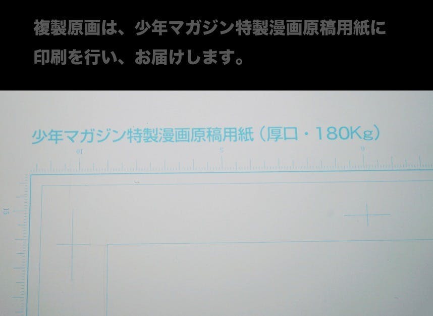 それぞれ270mm×373mmの少年マガジン特製原稿用紙に複製原画として印刷しお届けします。