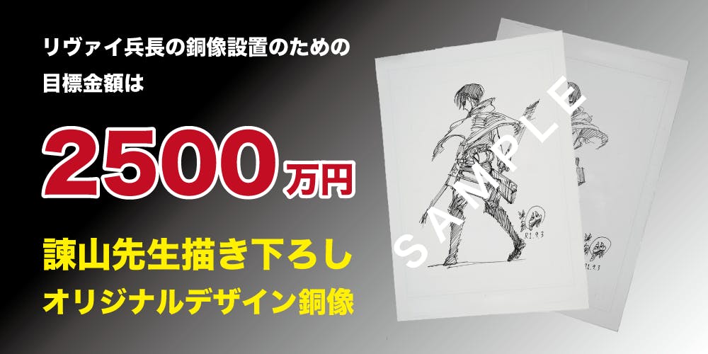 (リヴァイ兵長のデザイン原画のリターン追加は現状予定しておりません、また、リヴァイ兵長の銅像は既存リターンの除幕式でのお披露目もございません。予めご了承ください。)