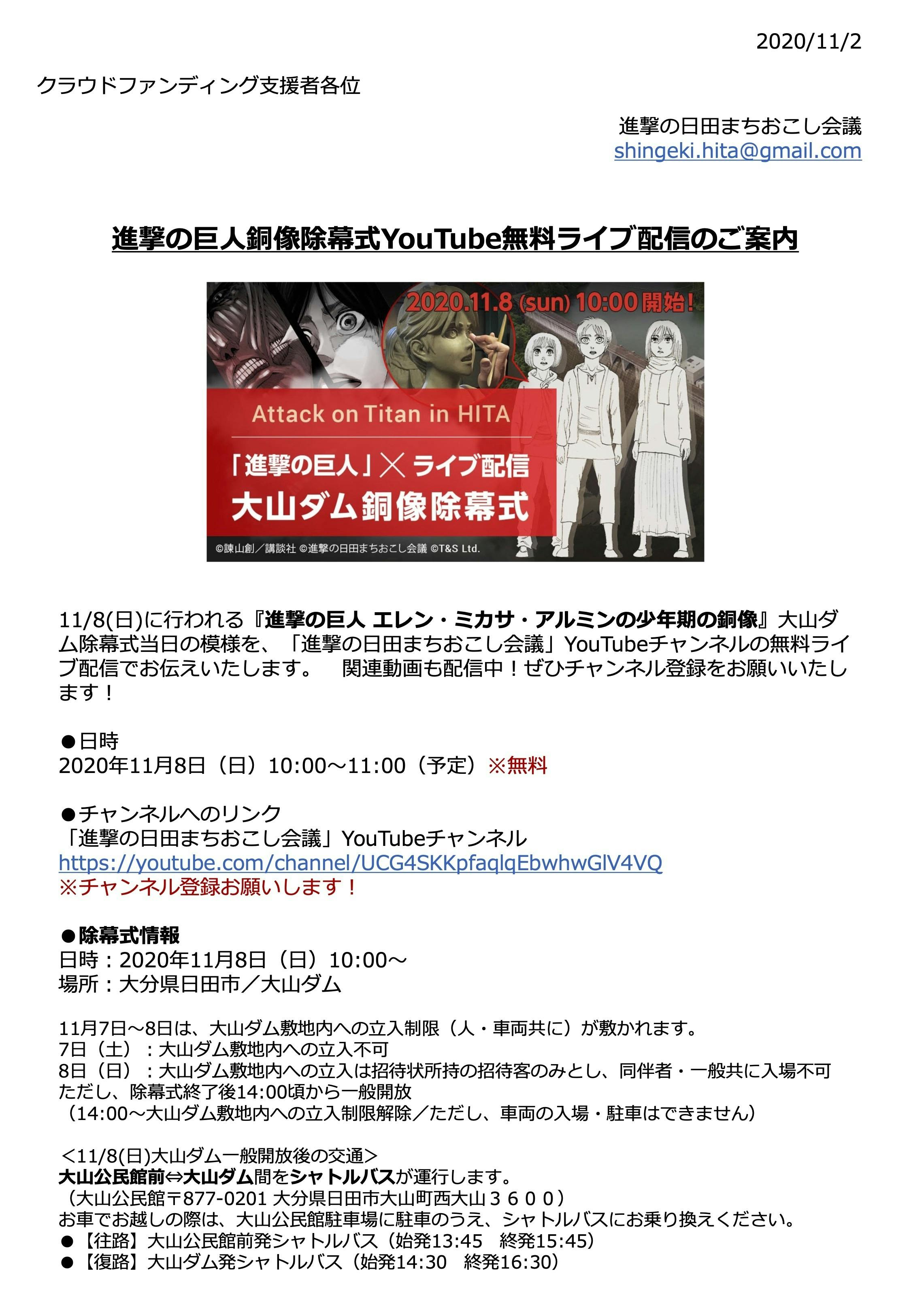 2020/11/02 19:44クラウドファンディング支援者各位 進撃の巨人銅像除幕式YouTube無料ライブ配信のご案内 11/8(日)に行われる『進撃の巨人 エレン・ミカサ・アルミンの少年期の銅像』大山ダ ム除幕式当日の模様を、「進撃の日田まちおこし会議」YouTubeチャンネルの無料ライ ブ配信でお伝えいたします。 関連動画も配信中!ぜひチャンネル登録をお願いいたし ます! ●日時 2020年11月8日(日)10:00~11:00(予定)※無料●チャンネルへのリンク 「進撃の日田まちおこし会議」YouTubeチャンネル https://youtube.com/channel/UCG4SKKpfaqlqEbwhwGlV4VQ ※チャンネル登録お願いします! ●除幕式情報日時:2020年11月8日(日)10:00~ 場所:大分県日田市/大山ダム 11月7日~8日は、大山ダム敷地内への立入制限(人・車両共に)が敷かれます。 7日(土):大山ダム敷地内への立入不可 8日(日):大山ダム敷地内への立入は招待状所持の招待客のみとし、同伴者・一般共に入場不可 ただし、除幕式終了後14:00頃から一般開放 (14:00~大山ダム敷地内への立入制限解除/ただし、車両の入場・駐車はできません) <11/8(日)大山ダム一般開放後の交通> 大山公民館前⇔大山ダム間をシャトルバスが運行します。(大山公民館〒877-0201 大分県日田市大山町西大山3600) お車でお越しの際は、大山公民館駐車場に駐車のうえ、シャトルバスにお乗り換えください。 ●【往路】大山公民館前発シャトルバス(始発13:45 終発15:45) ●【復路】大山ダム発シャトルバス(始発14:30 終発16:30) 2020/11/2進撃の日田まちおこし会議shingeki.hita@gmail.com もっと見る