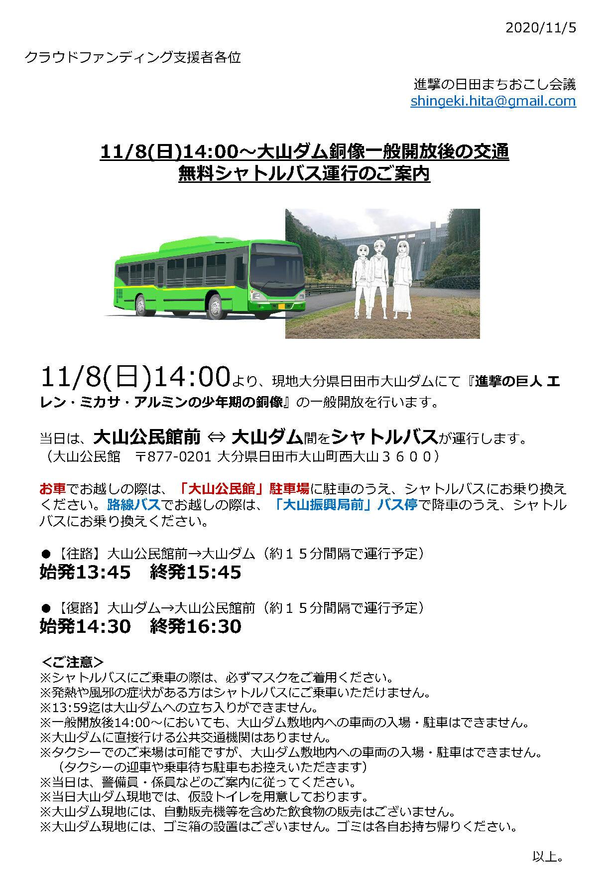 2020/11/05 19:40クラウドファンディング支援者各位11/8(日)14:00より、現地大分県日田市大山ダムにて『進撃の巨人 エ レン・ミカサ・アルミンの少年期の銅像』の一般開放を行います。 当日は、大山公民館前 ⇔ 大山ダム間をシャトルバスが運行します。 (大山公民館 〒877-0201 大分県日田市大山町西大山3600)お車でお越しの際は、「大山公民館」駐車場に駐車のうえ、シャトルバスにお乗り換え ください。路線バスでお越しの際は、「大山振興局前」バス停で降車のうえ、シャトル バスにお乗り換えください。 ●【往路】大山公民館前→大山ダム(約15分間隔で運行予定)始発13:45 終発15:45 ●【復路】大山ダム→大山公民館前(約15分間隔で運行予定)始発14:30 終発16:30 <ご注意> ※シャトルバスにご乗車の際は、必ずマスクをご着用ください。 ※発熱や風邪の症状がある方はシャトルバスにご乗車いただけません。 ※13:59迄は大山ダムへの立ち入りができません。 ※一般開放後14:00~においても、大山ダム敷地内への車両の入場・駐車はできません。 ※大山ダムに直接行ける公共交通機関はありません。 ※タクシーでのご来場は可能ですが、大山ダム敷地内への車両の入場・駐車はできません。 (タクシーの迎車や乗車待ち駐車もお控えいただきます) ※当日は、警備員・係員などのご案内に従ってください。 ※当日大山ダム現地では、仮設トイレを用意しております。 ※大山ダム現地には、自動販売機等を含めた飲食物の販売はございません。 ※大山ダム現地には、ゴミ箱の設置はございません。ゴミは各自お持ち帰りください。 以上。2020/11/5進撃の日田まちおこし会議shingeki.hita@gmail.com もっと見る