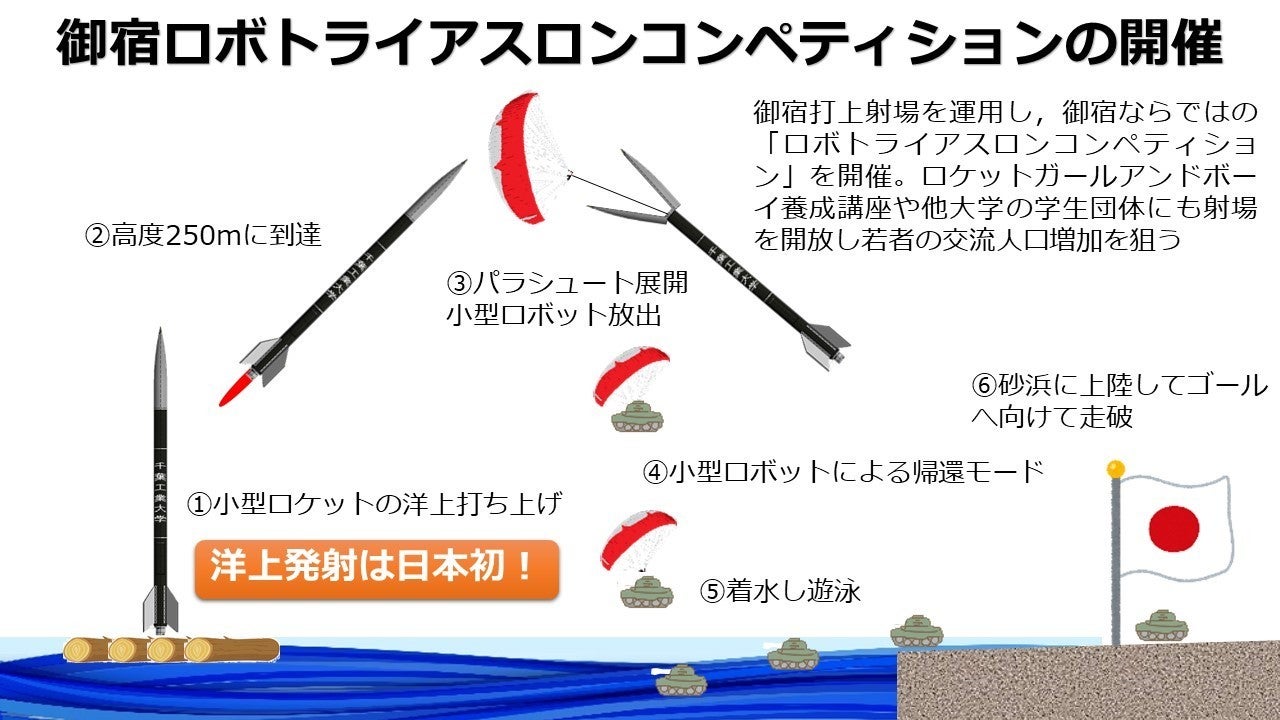 また、千葉工業大学では陸海空宇宙全てのロボット技術を駆使した「ロボトライアスロンコンペティション」の開催を計画しています。「ロボトライアスロンコンペティション」は、ロケットに搭載された小型洋上遊泳ロボットが打上げ後にパラシュートで落下し、洋上を泳いで浜辺に到達、浜辺を移動してゴールに向かう競技会です。今回のイベントでは「ロボトライアスロンコンペティション」を想定した洋上遊泳ロボットをペイロードとして打ち上げます。