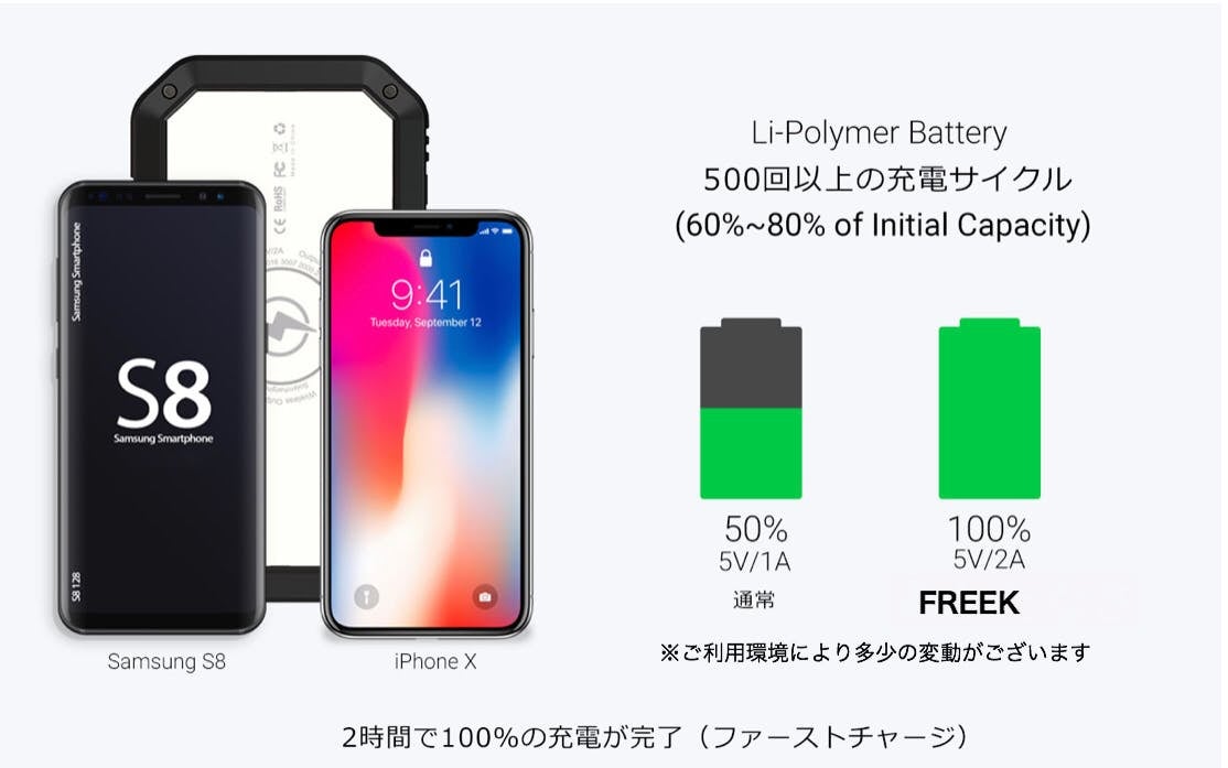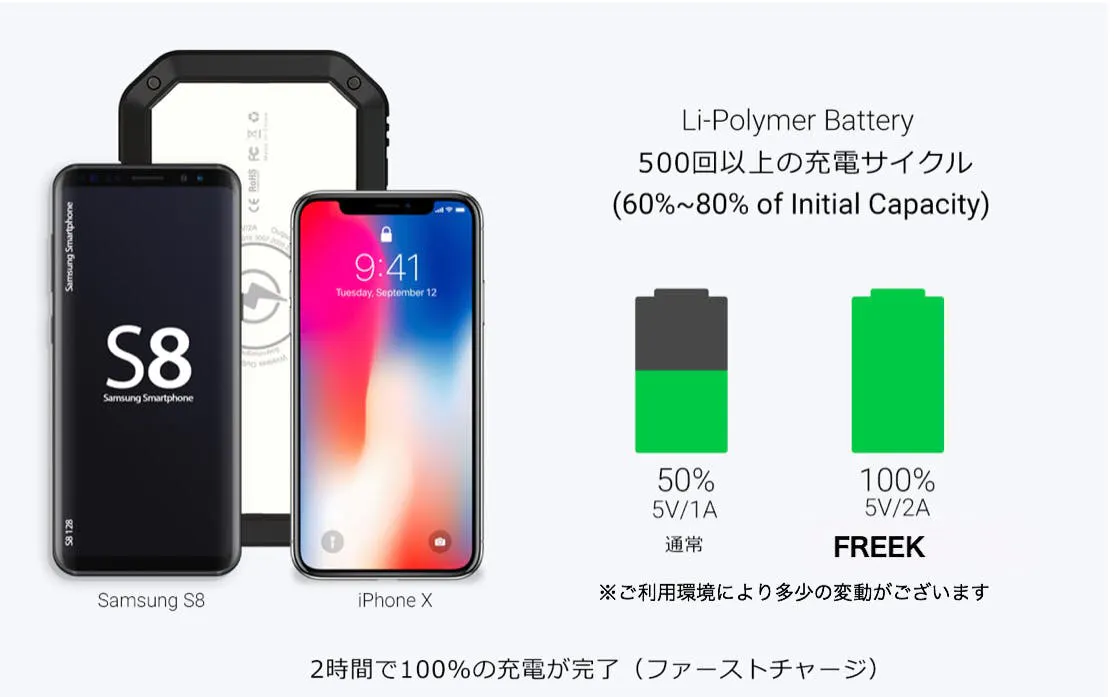 高密度リチウムポリマーバッテリーの技術によって小さなサイズの中に大容量のバッテリーを搭載しています。コンパクトな設計が採用されたFREEKは、持ち運びが便利です。手のひらサイズに全ての機能が搭載されています。
