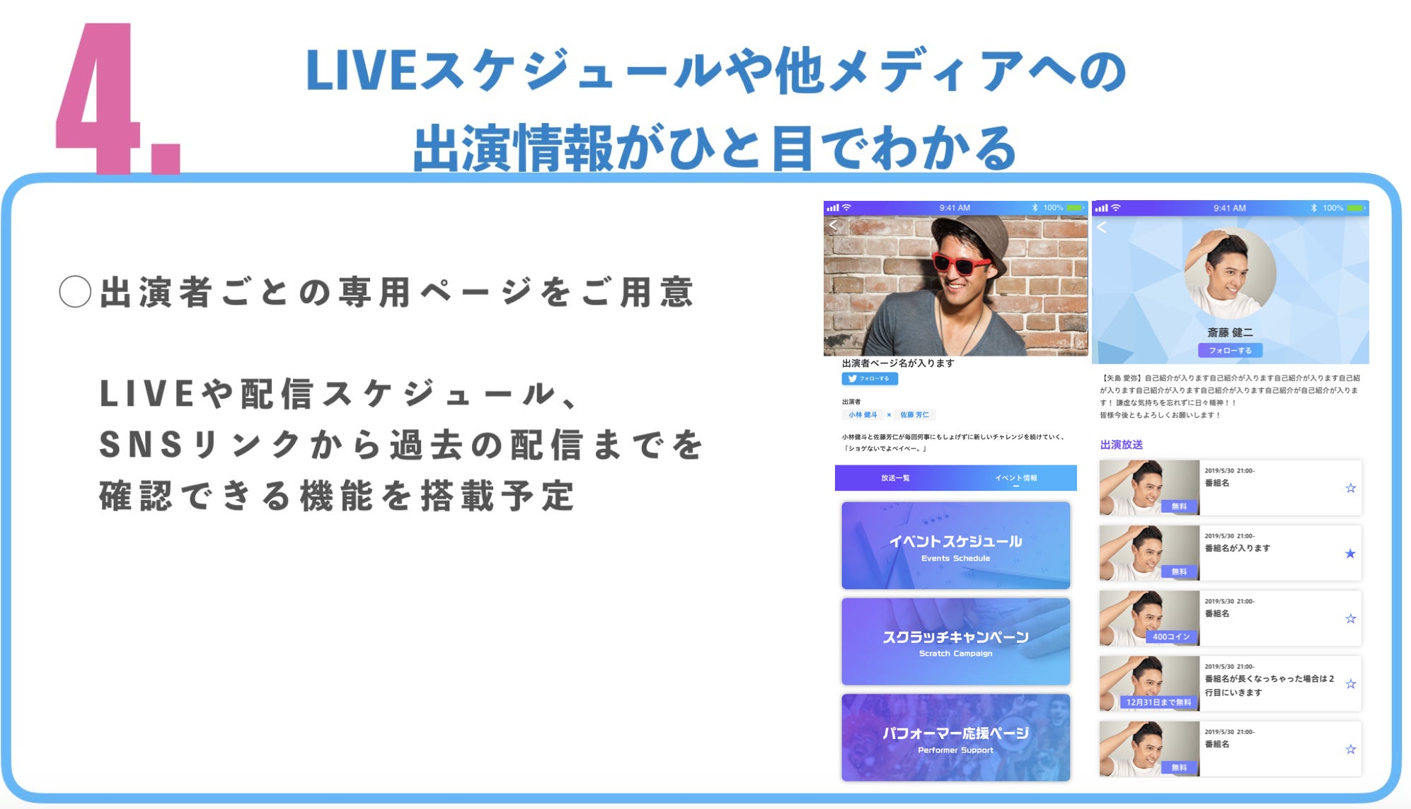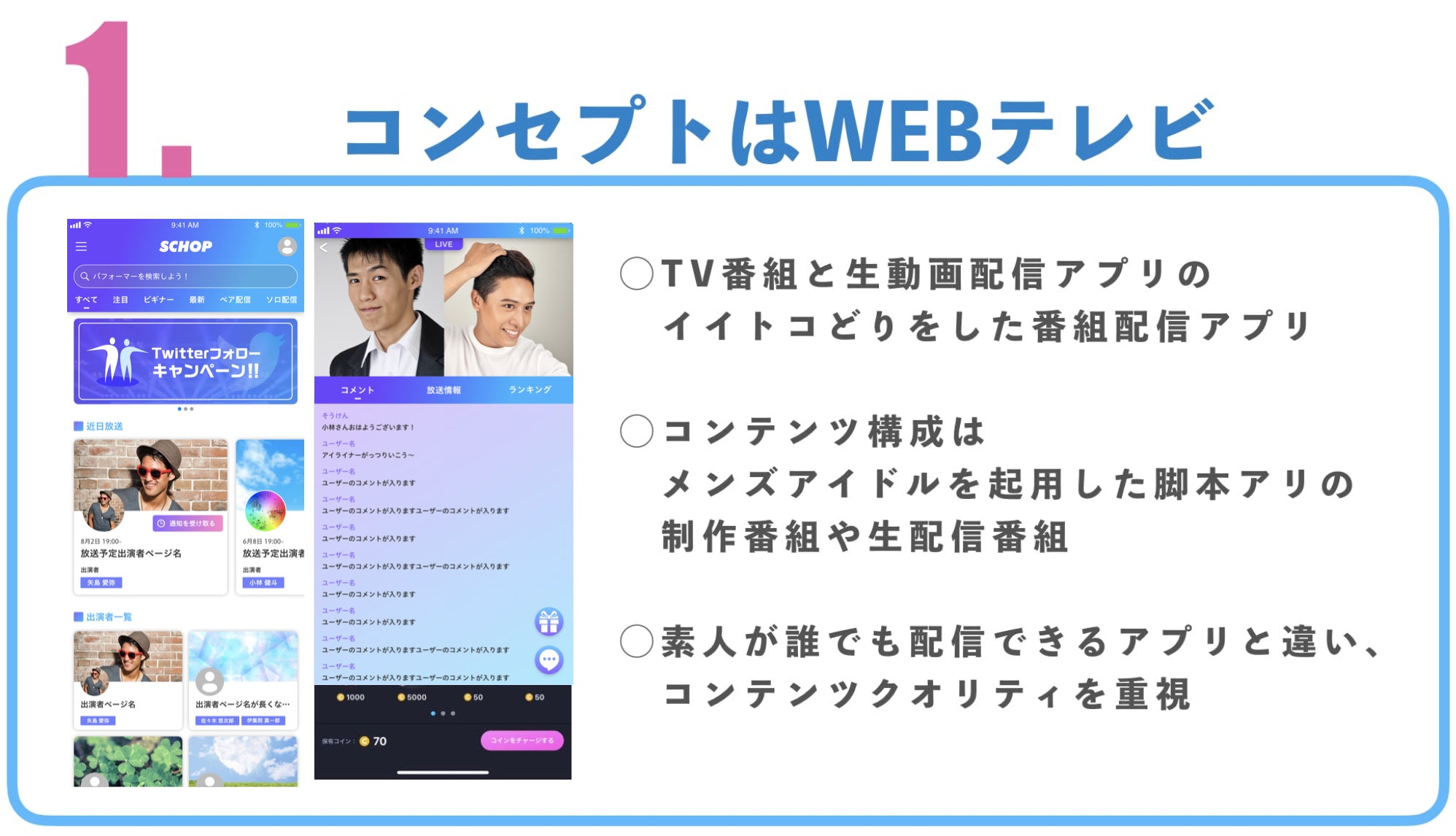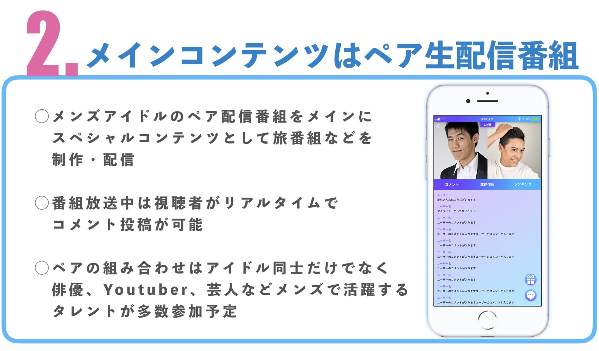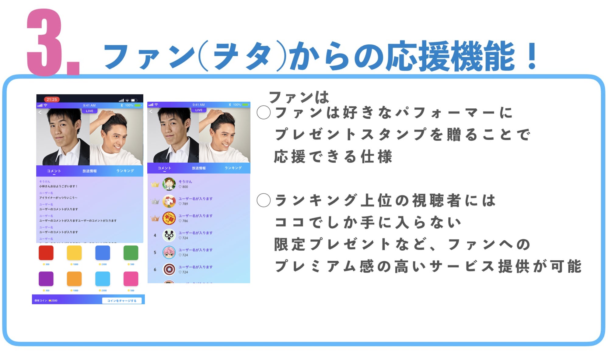 アプリの特徴をご紹介していきます!既存サービスにない面白さや、かつメンズアイドルの活動を応援していくことを重視した企画・機能の数々です!
