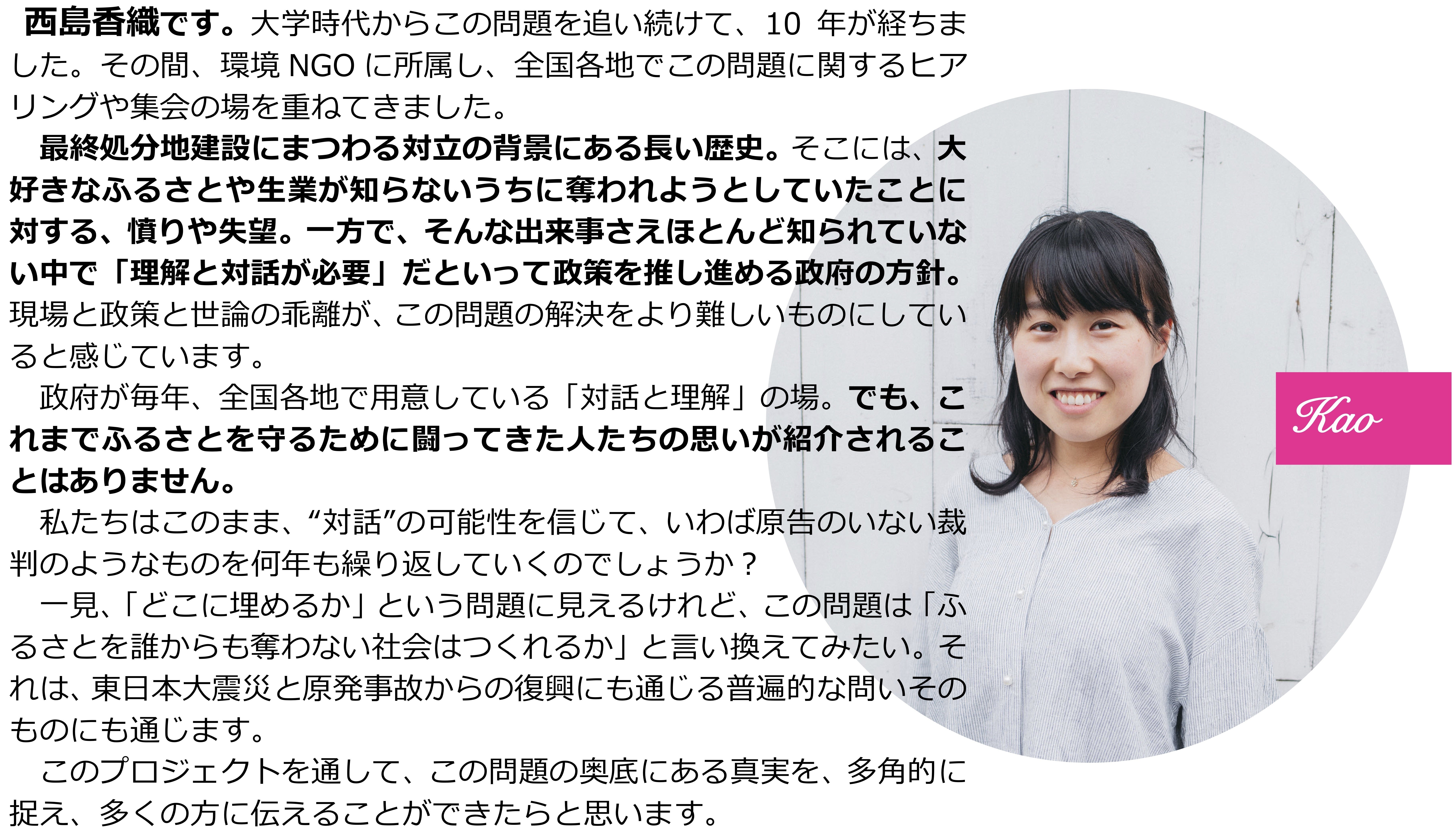 常に私を突き動かし続けているのは、現地で声を上げ、奮闘してこられた方々の“危機感”、そして“生命”を大切にする姿です。今なお接する立地地域の方々の危機迫った声は、国が示すことや答弁よりも、胸を突くものがあります。「核燃料サイクル計画」について立ち止まって考えるべき今だからこそ、多くの人と、核関連施設立地地域、とりわけ「核燃料サイクル計画」に直結する地域の人々の闘いの歴史や現状、声を共有したいと思っています。そして、まだ違う選択をできる今を生きる私達だからこそ、「核燃料サイクル計画」を闇雲に推し進めるのではなく、立ち止まり一緒に考えるキッカケにしたいと思っています。
