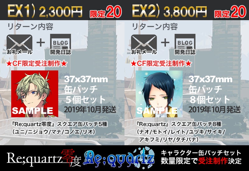 上記のEX1/EX2コースは2019/9/13(金)21時より受注開始・2019年10月にリターン品発送となります。こちらの新規2コースにゲーム製品版や特別小冊子は付属しませんので、缶バッチが欲しいという方がいらっしゃいましたら、ご支援をご検討頂ければ幸いです。