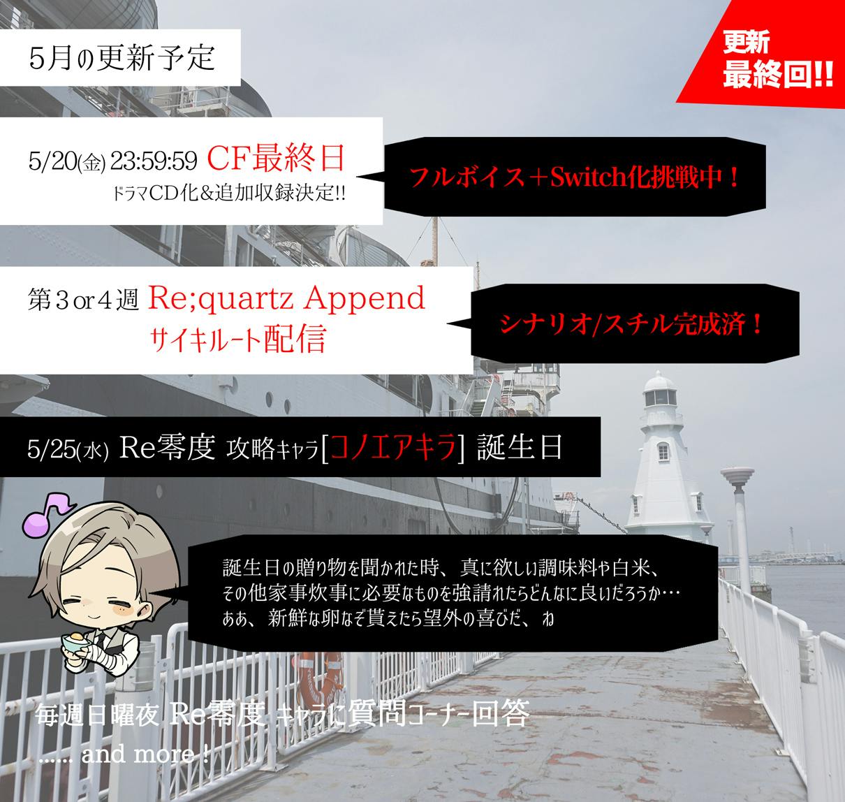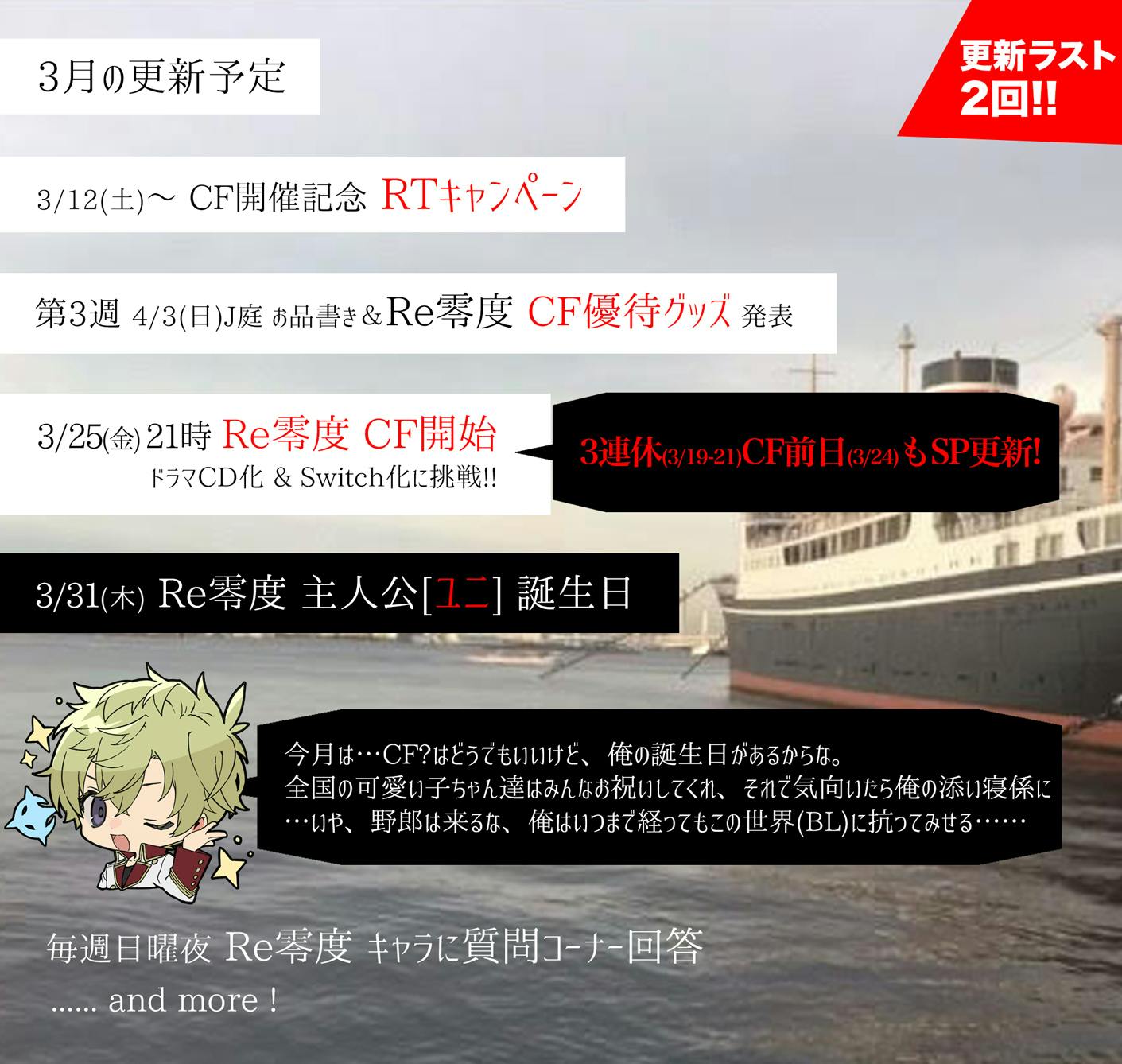 2022/03/09 20:06こんばんは!B-cluster主催のゆきみです。毎月1回、月末に活動報告にて製品版&新クラウドファンディングの進捗を報告!…ですが、CAMPFIRE上での月末活動報告は今回含めてラスト2回!!今後の月末活動報告については、本記事でご案内しますのでぜひクラウドファンディング(以下、CF)の最新情報をご確認ください。今回のサムネ画像は、ゲーム本編エンディングムービーからの1枚!数年前、氷川丸の横で陽が落ちるところをずっと一人で撮影していたのが懐かしいです…。___◆CF最新情報◆Re;quartz零度、新CFプレページ&お返し一覧公開!★CFプレページはこちら★3/25(金) 21時開始のCFプレページがついに公開!★2019年CF復刻品&今回CF限定ボイスドラマや描き下ろしグッズ・SS小冊子など多数ラインナップ!ぜひ一度チェックしてみてください★前回のCFでお世話になった方が現在いらっしゃること・また、プラットフォーム側に支払う手数料が他サイトに比べて大幅に安いことから、今回はCFを実施するプラットフォームを『うぶごえ』に変更しました。個数制限があるコースをご支援予定の方は、CF開始前の『うぶごえ』会員登録がオススメです!詳細はCFページ内の下部『うぶごえからの注意事項』をご確認ください。___◆2月の更新情報(CF以外)◆2/6はマナ誕生日! 限定デザインのネットプリント配布!マナの誕生日に、沢山のお祝いを頂きまして誠にありがとうございました! 発売から1年以上経っても、温かいお祝いの言葉やメッセージを頂けることに本当に感謝です…;;! ハッシュタグを使ったお祝いもとても嬉しかったです。当日はTwitter上で、マナの直筆メッセージ記載のイラストをネットプリント形式で配布しました。また、座談会Q&A形式でED後マナ×ユニが質問に答える企画も実施!上記更新のまとめはこちらのツイートから始まるツリーをぜひご確認ください!SSシリーズ『幼語』完結! 最終話リオ×ユニ更新!★リオ×ユニ新作SS★ 愛【死】に至る病 はこちら『幼語』シリーズの最終作は、幼少期〜ゲーム本編開始前までを繋ぐリオ×ユニの物語でした。少しビターな物語は、リオの誕生日SS『1616』と合わせて読むのもオススメです!キャラに質問BOX、引き続き質問受付中!質問を送るお題箱はこちら現在はユニの誕生日(3/31!)に関する質問を送ると採用率が高いかも…!?今までの質問は、Twitterで『#Re零度_キャラに質問』ハッシュタグにてまとめてどうぞ!___◆イベント情報◆○開催中のイベント★20%OFF対象商品はこちら★CF開催を記念して、アニメイトゲームス様で配信中の作品が20%OFF!・Re;quartz零度 スマホブラウザ版・Re;quartz零度 副読本デジタルアーカイブ版の20%OFFは、これが最初で最後かも…!?気になっていた作品がある方は、この機会にぜひ!○今後のイベント予定2022年4月3日(日)東京ビッグサイト西2ホール J.GARDEN51け08a | B-cluster当日は2019年実施のCF同様、『CF参加者様優待特別ノベルティグッズ』を新規でご用意予定です。グッズ発表日は本ページ下部をご確認ください。そして、2022年のGW中も下記イベントに参加予定(申込済み)!・5月4日(水・祝)東京ビッグサイト SUPER COMIC CITY 29 -day2-・5月5日(木・祝)東京ビッグサイト COMITIA140お品書きは4月のJ庭と同じですので、どうか皆様無理のないタイミングでお越しください。また、イベント開催時の社会状況によっては、開催1〜2週間前を目処に参加の可否について改めてお知らせします。新作グッズはイベント当日夜より公式BOOTHにて自家通販します!___そして……お待たせしました!ついに開催まで一ヶ月を切ったCF詳細&3月末までの更新予定を大発表!◆3/12(土) 21時:Re;quartz零度 CF開催記念 Twitter RTキャンペーン開催◆ →『あの』グッズを全種一気に手に入れるチャンス! 皆様のご参加お待ちしております!・3/13(日):『キャラに質問BOX』Twitter回答日◆3月第3週:4/3J庭お品書き&CF参加者優待グッズ発表◆ →CFアンケートでもご要望を頂きました『アクリル系』のとある新作グッズを製作します!さらに…CF直前の3連休中(3/19~3/21)&CF前日(3/24)にも、CF関連のスペシャル更新を予定!・3/20(日):『キャラに質問BOX』Twitter回答日◆3/25(金) 21時:Re;quartz零度 新CF 開始◆ →CF限定の激レアお返しが多数ラインナップ! ぜひページだけでも見ていってください…!・3/27(日):『キャラに質問BOX』Twitter回答日※お誕生日前夜祭※ →ユニのお誕生日直前! お祝いのメッセージや質問大募集中です!◆3/31(木):Re;quartz零度主人公『ユニ』お誕生日◆ →当日はぜひ0時に公式Twitterをご確認ください♪ →主人公の誕生日ならではの『連載企画』も準備中…!?・4月初旬頃:活動報告更新 →CAMPFIRE上の活動報告更新は、この回が最終回!5月以降の活動報告更新は『うぶごえCFページ上』を予定しております。応援してくださっている皆様に、Re;quartz零度の新たな展開をお届けできるよう、また、少しでも毎日の生活の中での楽しみになれるよう、『参加して良かった!』と思って頂けるようなCFになるよう、精一杯25日に向けて準備を続けて参ります。