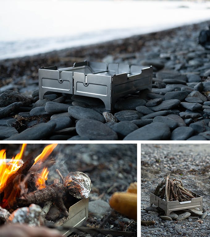 Fire Safe と GRILL M1はポータブルなステンレスの焚き火台とグリルのセット。併用も可能で、どこでもBBQや焚き火ができるミニマルでシンプルな見た目のアウトドアギアです。
